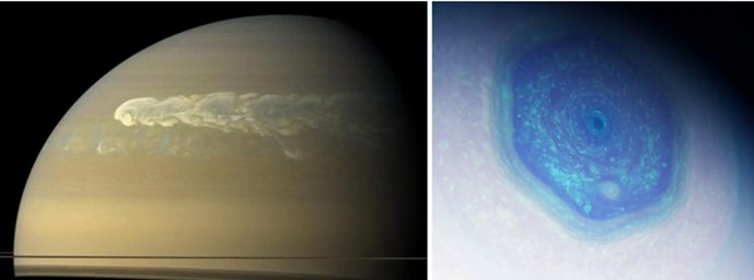 Великое Белое Пятно — так называют явление на Сатурне, возникающее ненадолго каждые 20-30 лет и оставляющее пятна на большей части поверхности планеты. Это последствия штормов — яркие белые облака аммиака, поднимающиеся высоко над основной облачной поверхностью. Многие из таких пятен по диаметру больше диаметра Земли. А иногда они забираются даже в область шестиугольника.