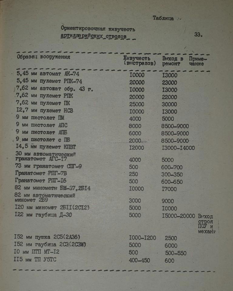 Ориентировочная живучесть стволов артиллерии, стрелкового оружия.