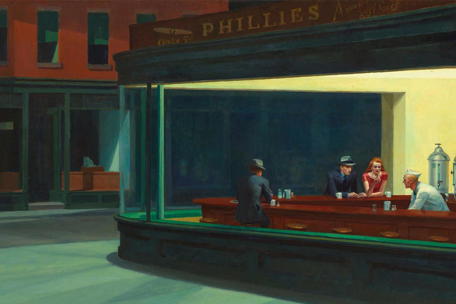 Свет в заведении, что пробивает ночной полумрак. Он превращает происходящее в театральную сцену, лишённую зрителей. Судя по надписям, время происходящего — 1940-е годы, эпоха, вызывающая грустную ностальгию, даже если Вы её не застали.