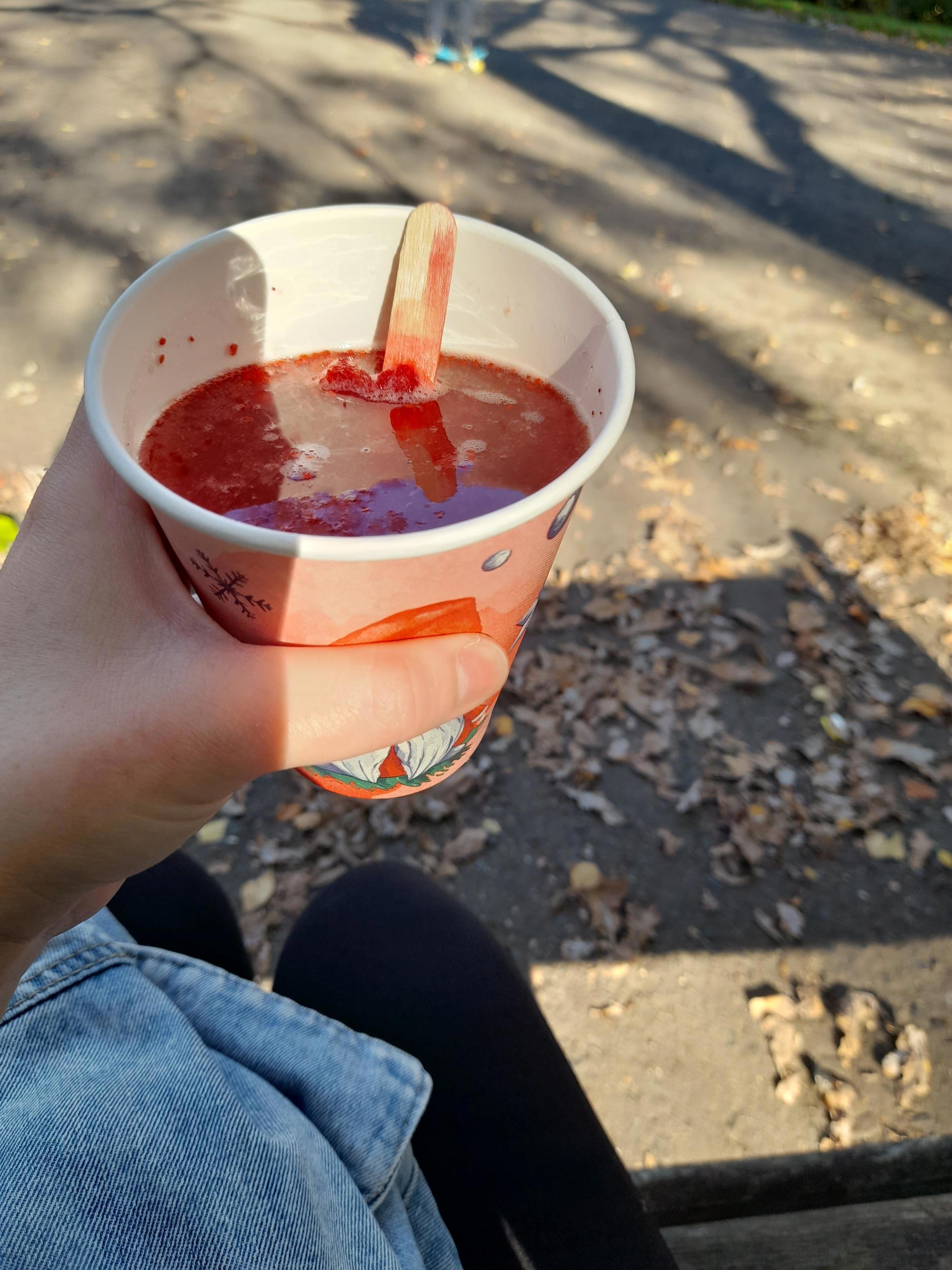 Рядом со входом стоит ларек. Купила себе брусничный крафтовый чай, но предположила, что это клюква, а не брусника.