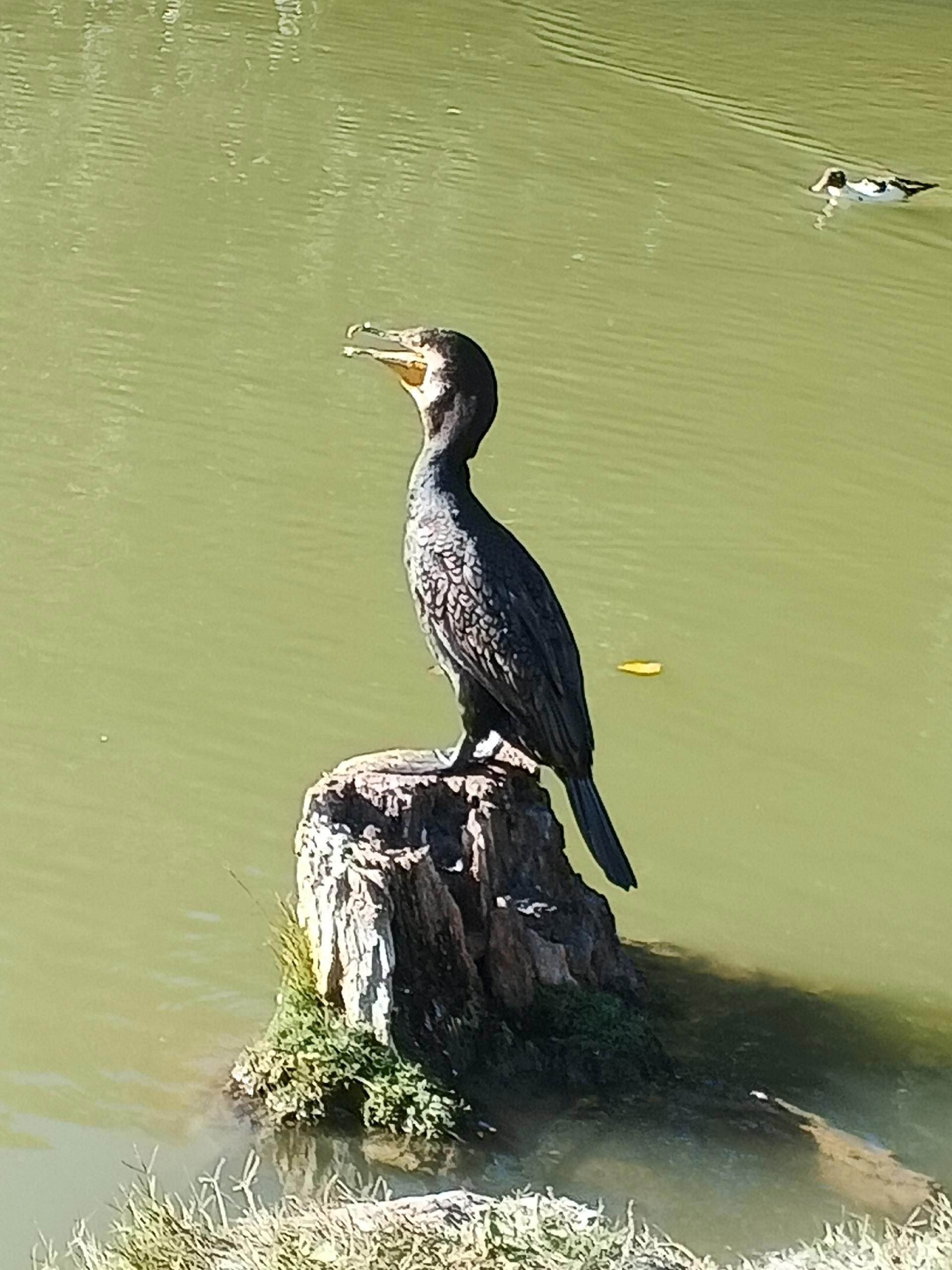 Дальше, на излучина стоит старый пень, а на нём... Старый знакомец, баклан Яшка. Яшка всегда прилетает в Симферополь перед холодами и живёт в Гагаринском парке в своё удовольствие всю зиму, в середине весны он улетает, чтобы осенью вернуться. Недавно он прилетал с другом, а может быть с подругой, но сегодня он сидел один и демонстрировал себя с большим удовольствием.