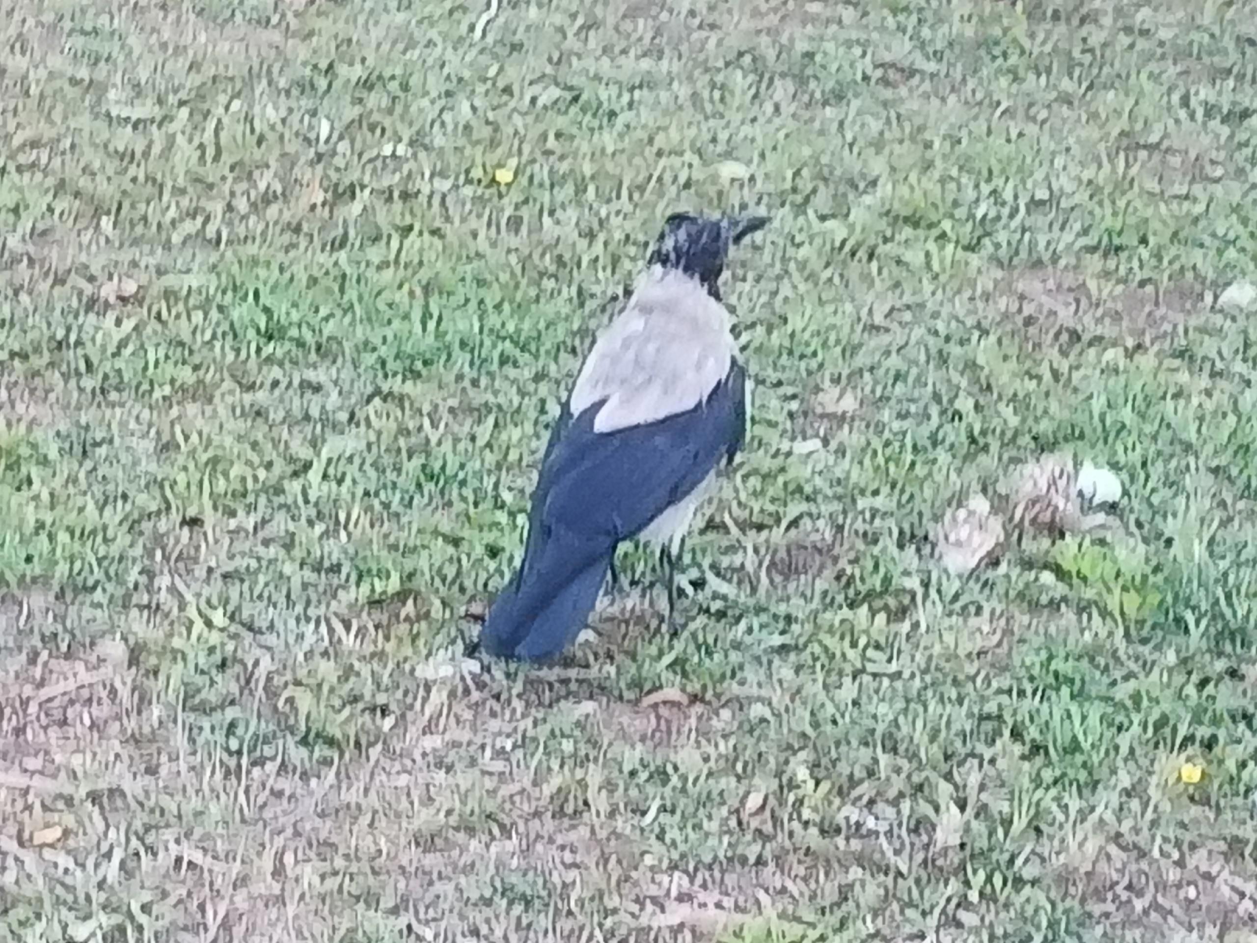 А под деревьями на газоне гуляет молодая ворона. Ещё голенастая, встрёпанная, но очень забавная.
