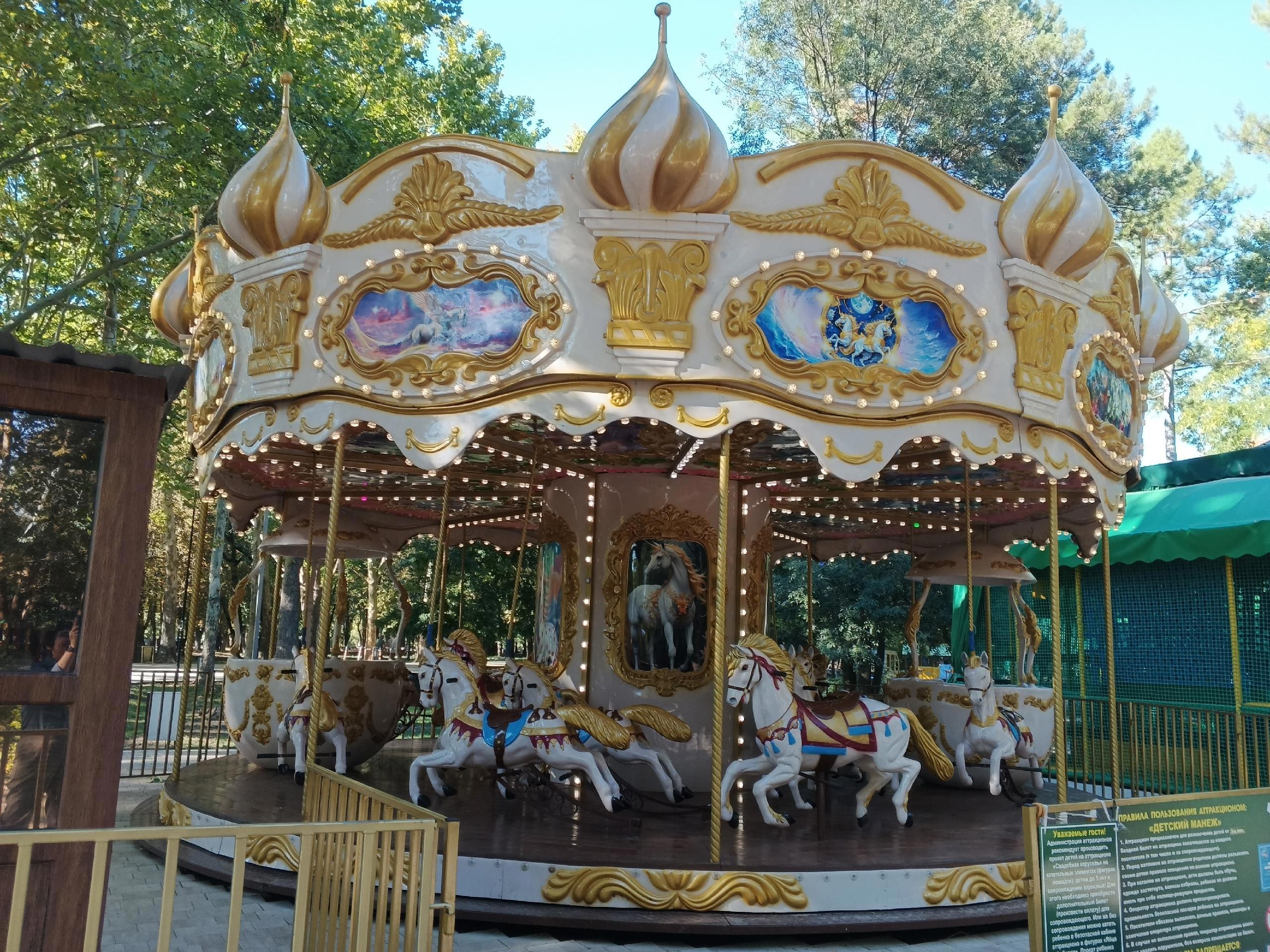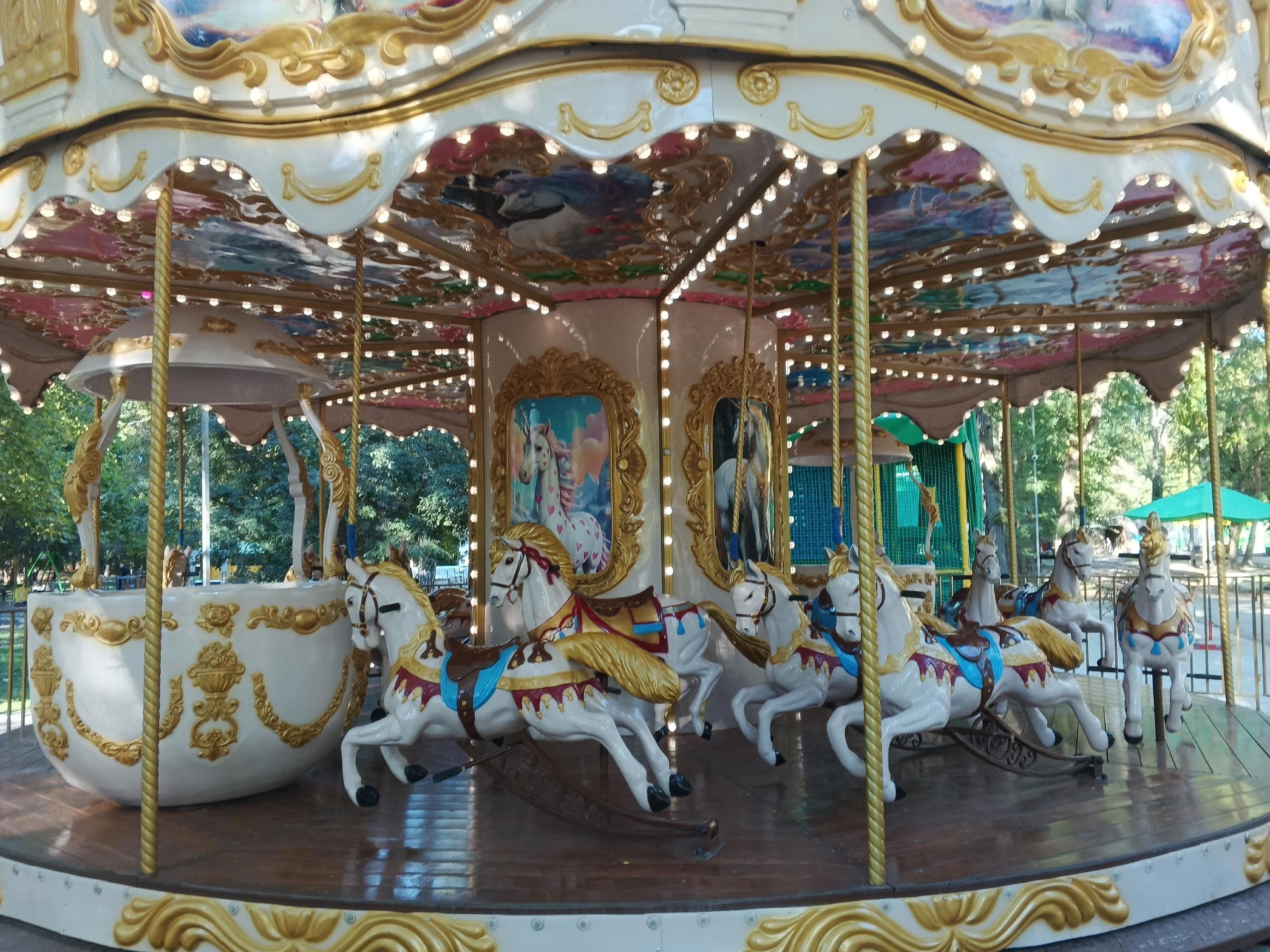А дальше стоит очень красивая карусель. Сделана она по образцу каруселей конца 19 начала 20 века. Это брогато украшенная карусель с лошадками. Вечером и в выходные дни здесь полно детворы, в три часа дня детвора только подтягивается. Но карусель ждёт их с самого утра.
