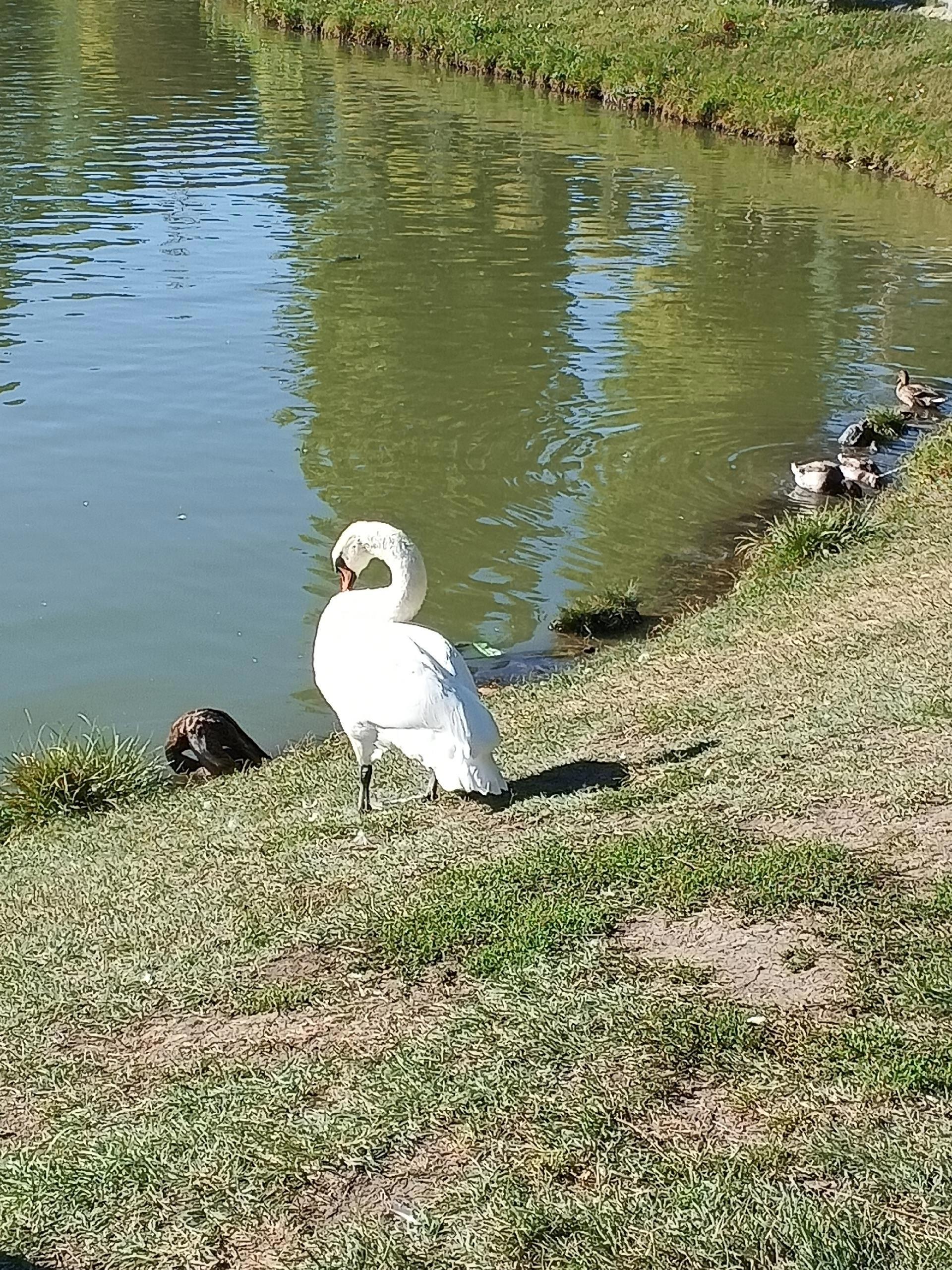 После того, как мы внимательно рассмотрели как работают рабочие облагораживая парк, мы потихоньку обошли пруд. На берегу важно сидел лебедь. Он явно сбежал и от супруги, и от деток, хотелось ему явно просто посидеть, привести себя в порядок.