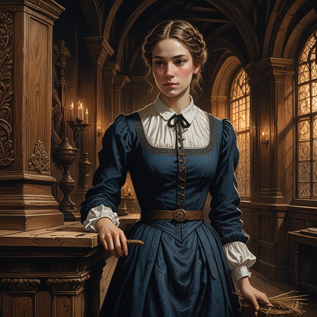 Она двигалась легко и проворно, как и положено служанке. Её руки, некогда нежные, теперь немного загрубели от постоянной работы, но она не считала это унижением. Её платье, хоть и простое, всегда было опрятным: темно-синее, стянутое узким поясом.