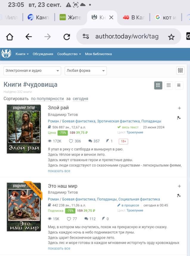 В категории "чудовища" на AuthorToday сегодня лидирует фауна Троелуния - глубинный жабообразный народ, крылатые шлюхи феи, хищные русалки, лесные орки, исполинский кракен и отбитая ирландская сука другие удивительные создания.