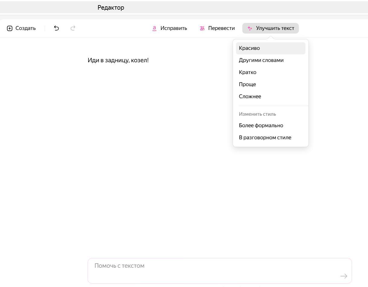 Я люблю стебаться над нейроулучшателями текстов. К примеру, даешь задание улучшить вот эту фразу, переписав ее более красиво.