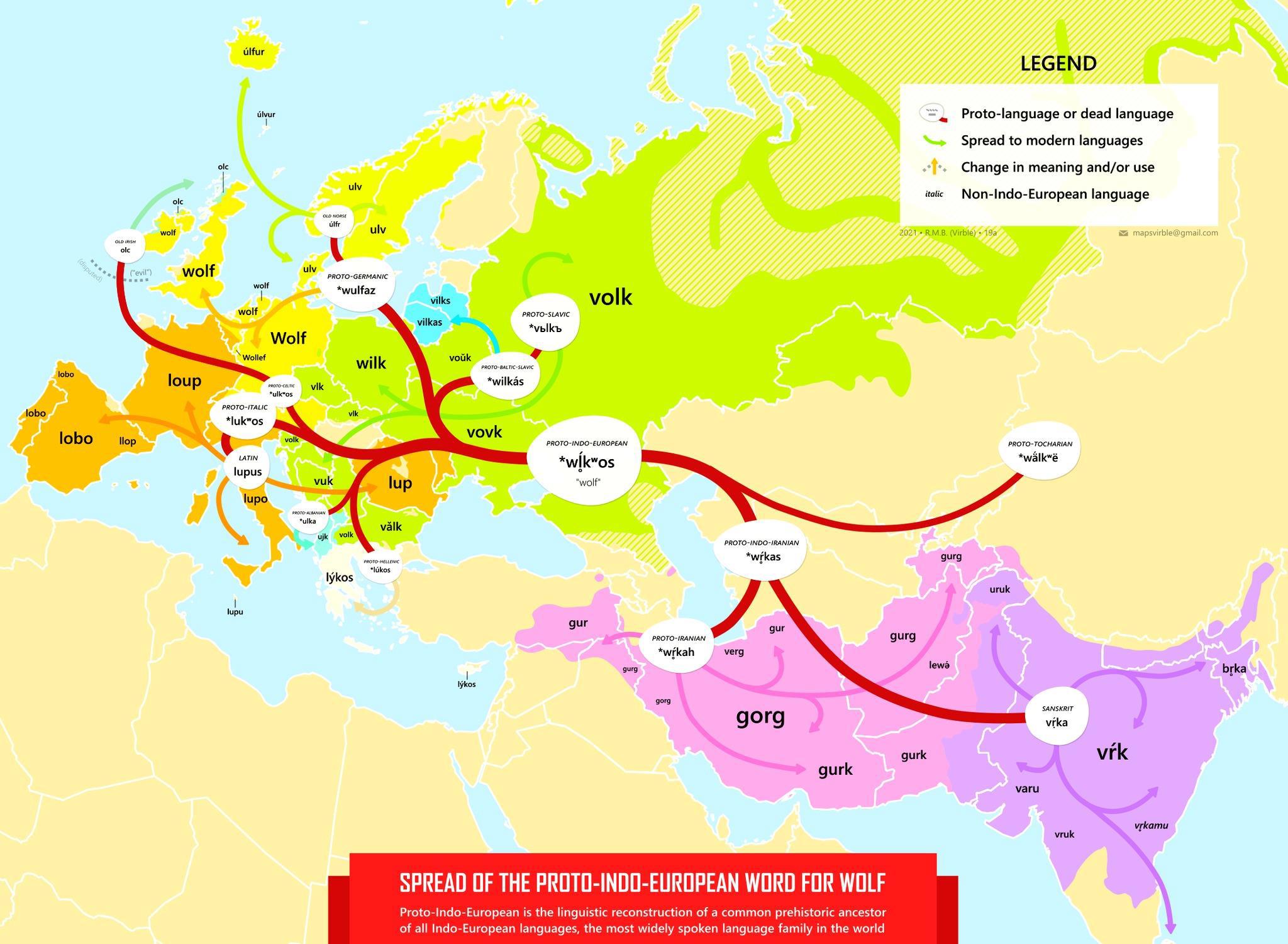 Из степей в леса древнее слово, обозначающее волка, распространилось далеко и широко с распространением индоевропейских языков. Многие современные слова, такие как wolf (английский), loup (французский), lupo (итальянский), varg (шведский), volk (славянский), восходят к одному и тому же праиндоевропейскому корню. Это напоминание о том, что язык — это история, и даже одно слово может нести в себе отголоски миграции, культуры и мифов.