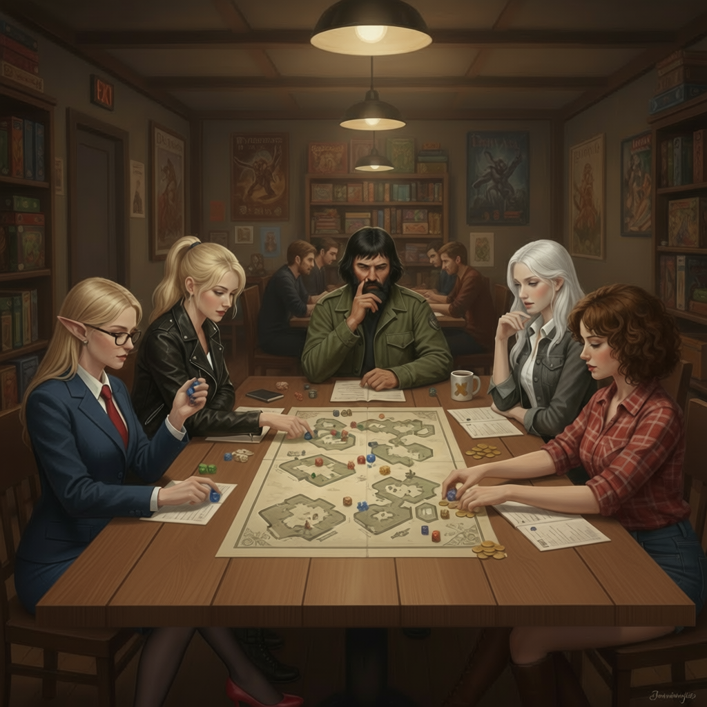 Автор: Руслан БирюшевВот одна из старых задумок, которую реализовать мне позволили только нейросети. заказывать такое у живого художника не хватило бы никаких денег, ведь они берут плату за каждого персонажа в кадре. Троица "Светлых голов" и их связные в гвардии герцогини, леди Мария и леди Эмилия, вместе играют партейку в ДнД... которую мы читаем в виде романов :) А на самом деле, разумеется, "Светлые головы" - это частное детективное агентство, а Мария и Эмилия их подруги из полиции.