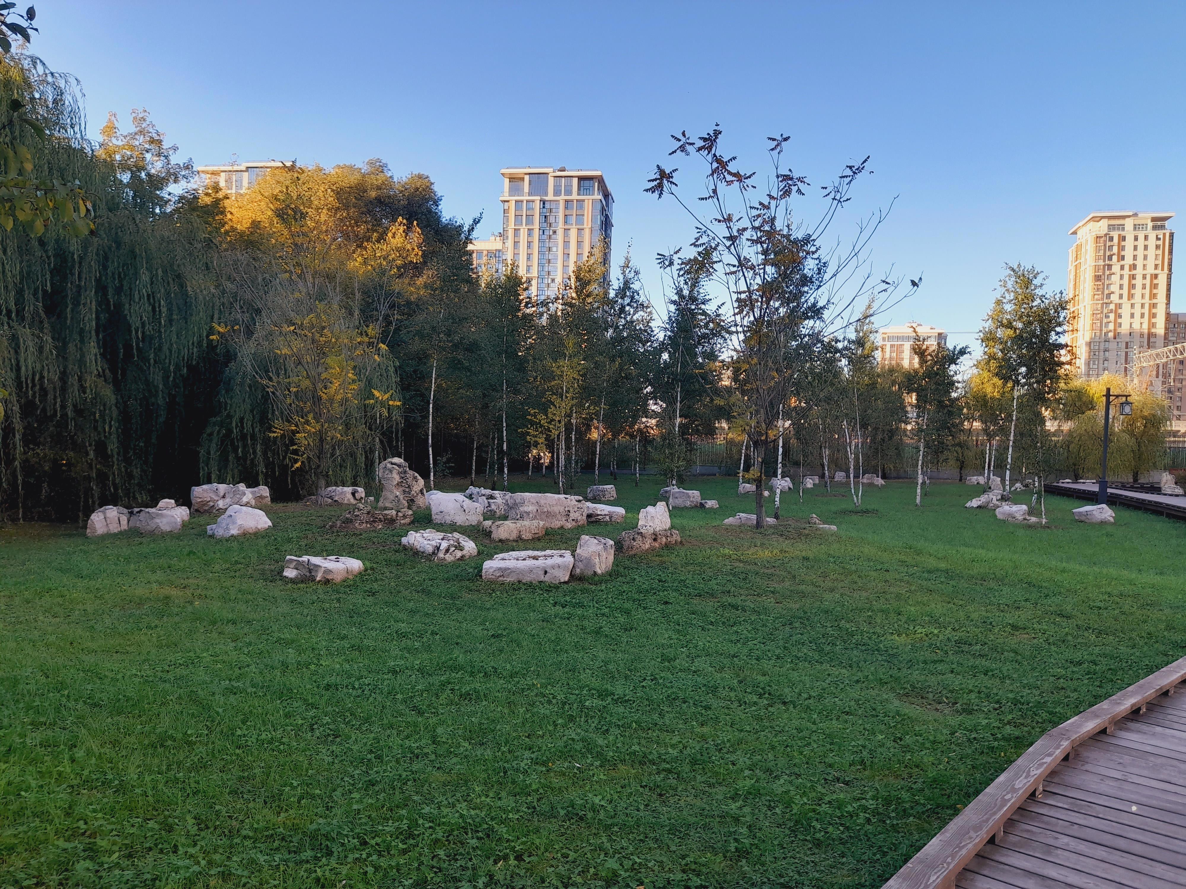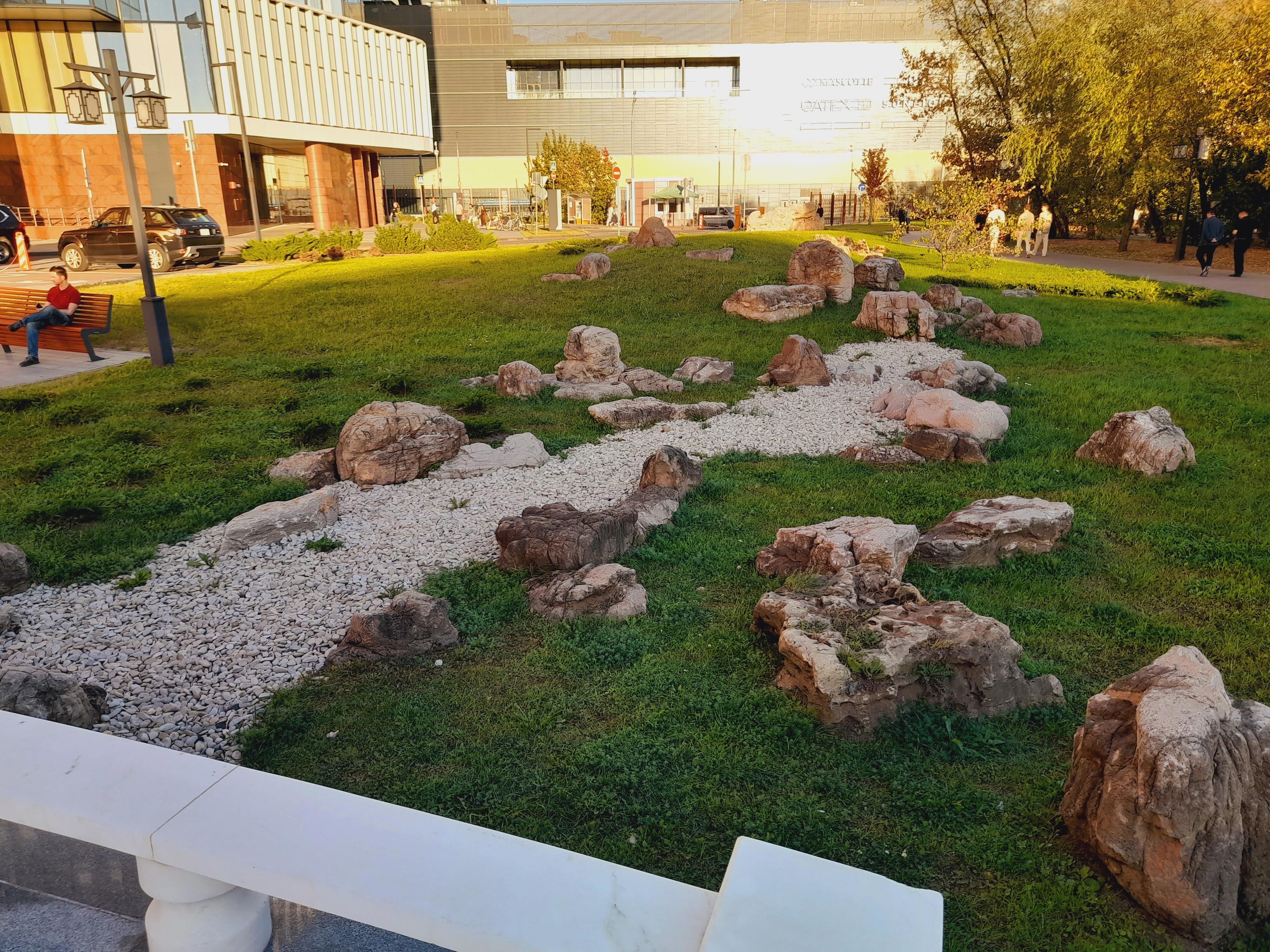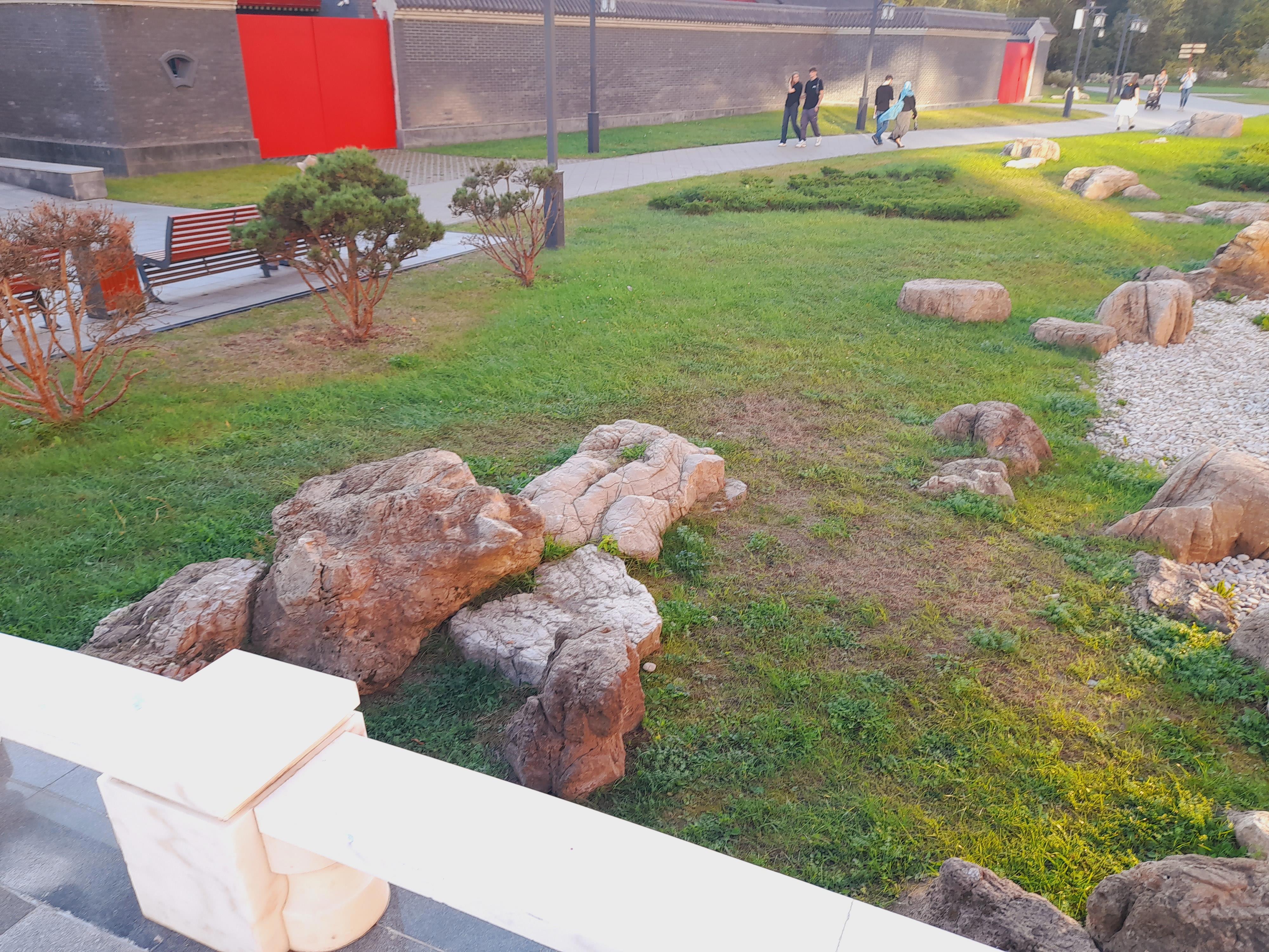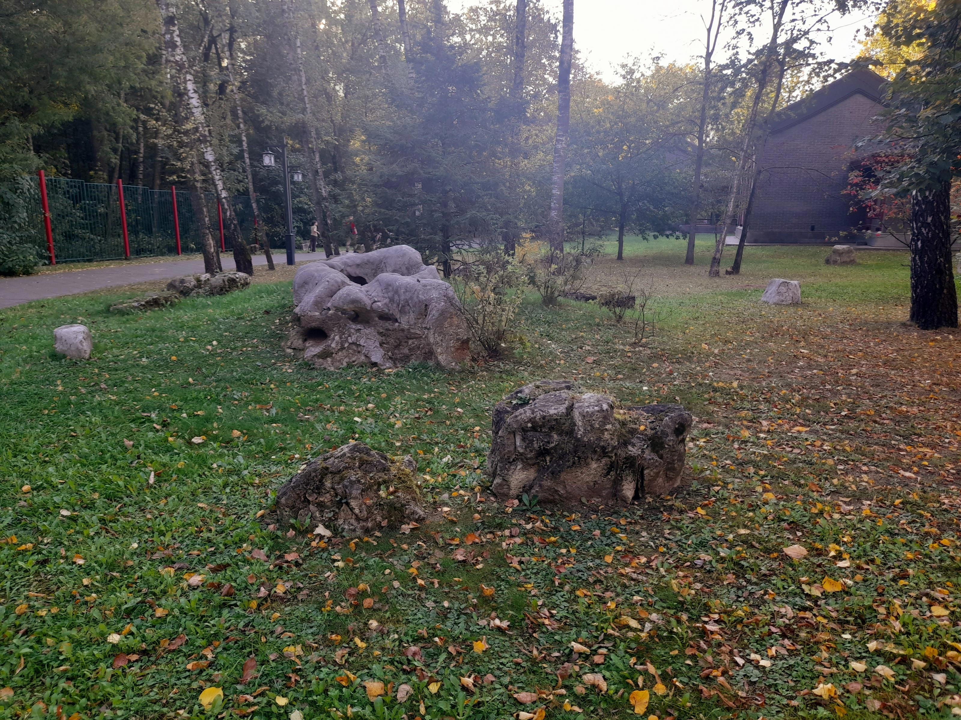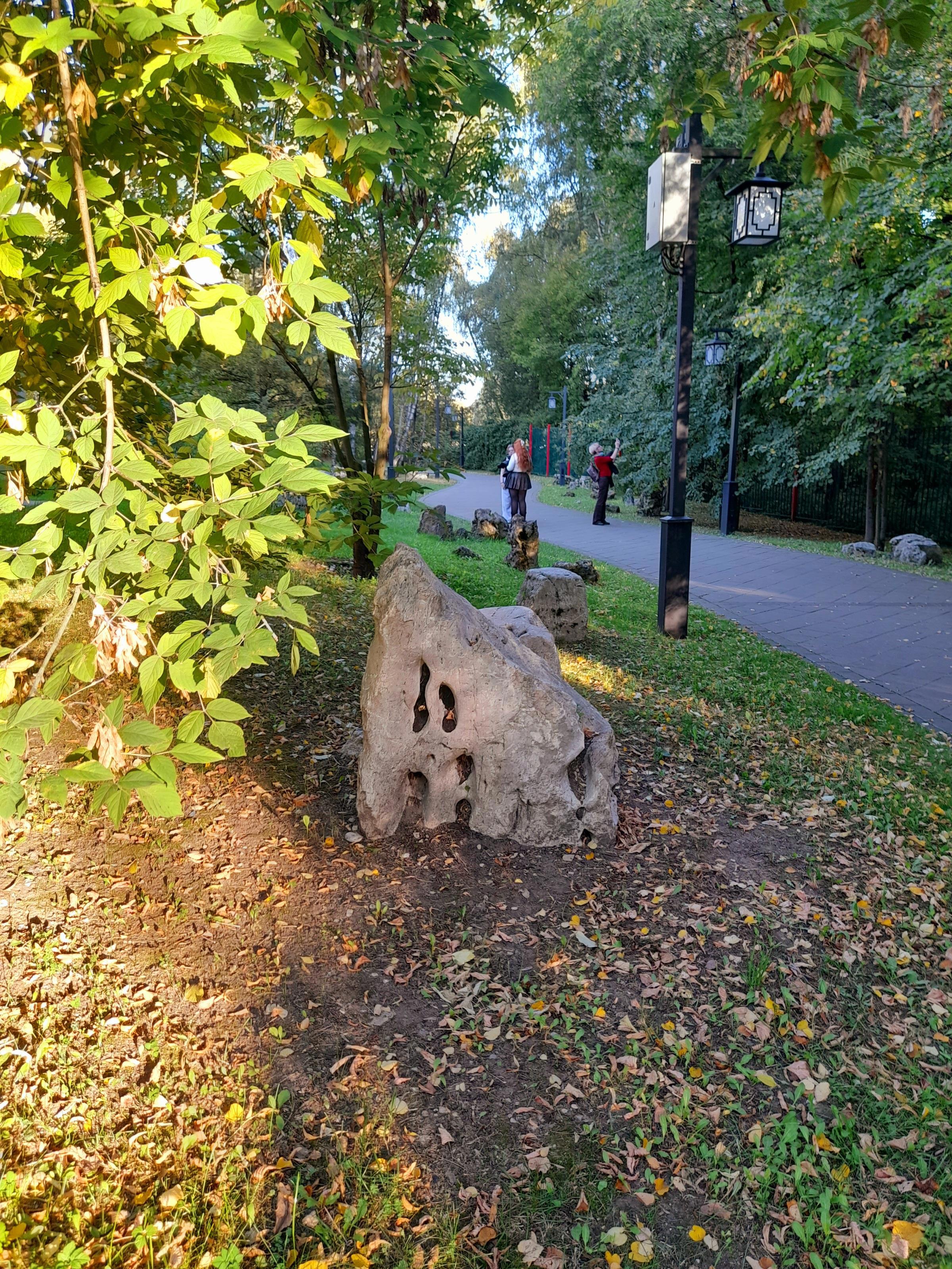 Все бы ничего, но охранники там, словно церберы, готовы перегрызть глотку ступающим на газон людям! Я хотела сфоткаться в камнях и сошла с дорожки -- столько выслушала! Две женщины фотографировались под сосной у пруда и один из охранников на них наехал за то, что встали на газон. В общем, они с ним поругались. Он орал, что не дорожит своей работой и может показать им, где раки зимуют, и сразу же уволиться, если начальство этого не оценит. Это, мол, частная территория, у них свой регламент, куда не пускать, и здесь запрещено вот так всюду топтаться. Одна дама сказала, что он испортил им снимок. А он ответил, что, значит, она -- плохой фотограф...