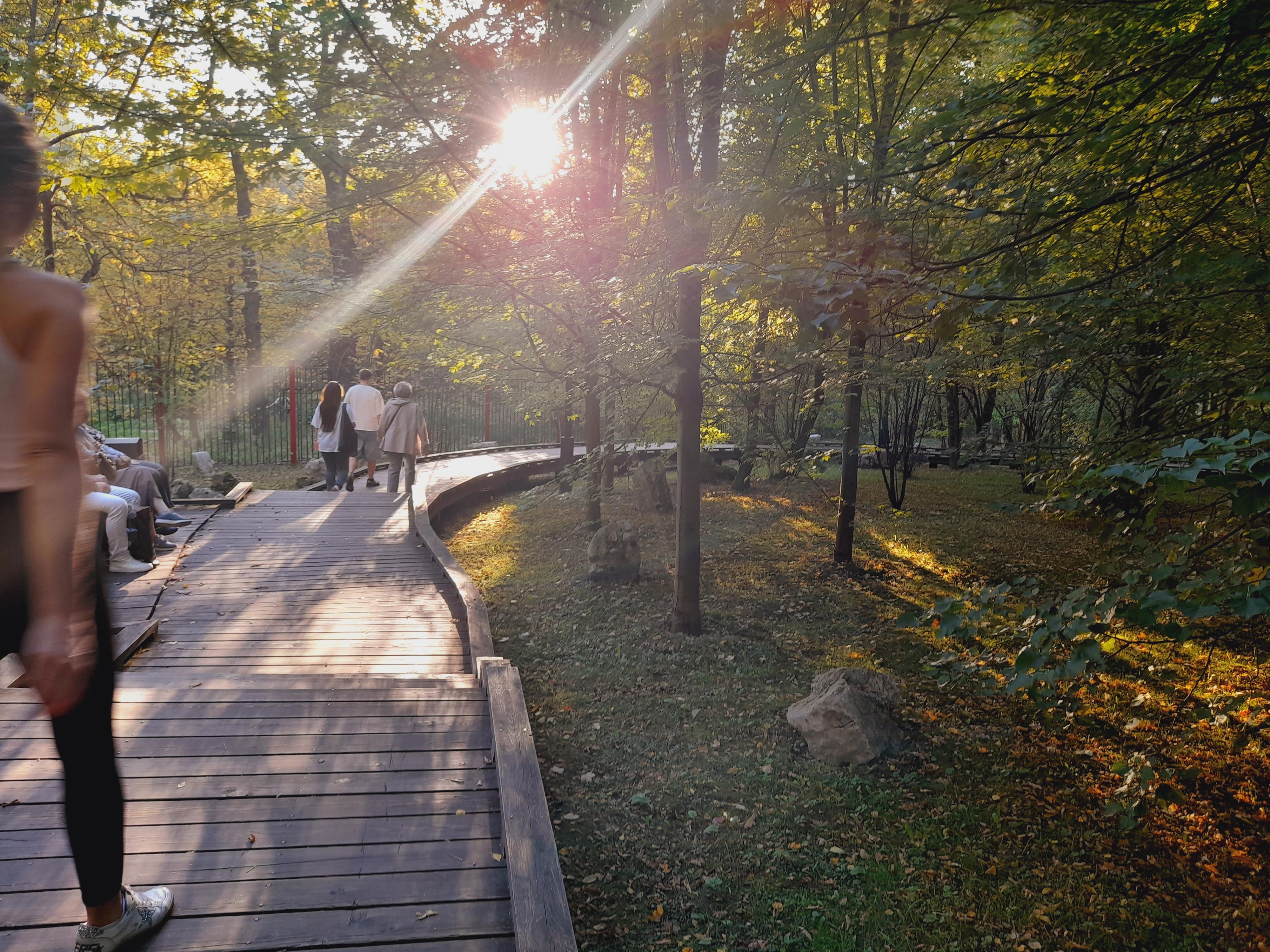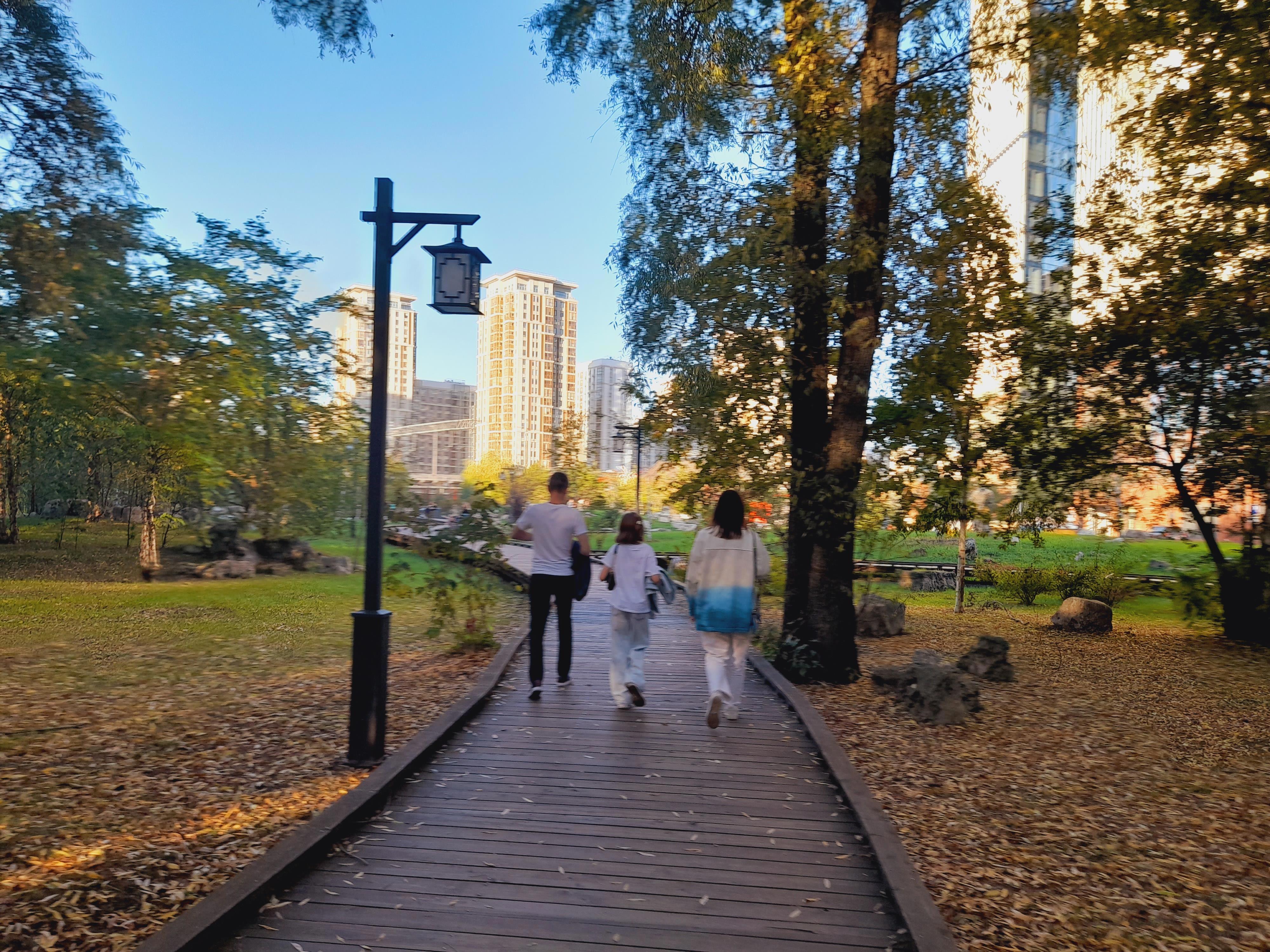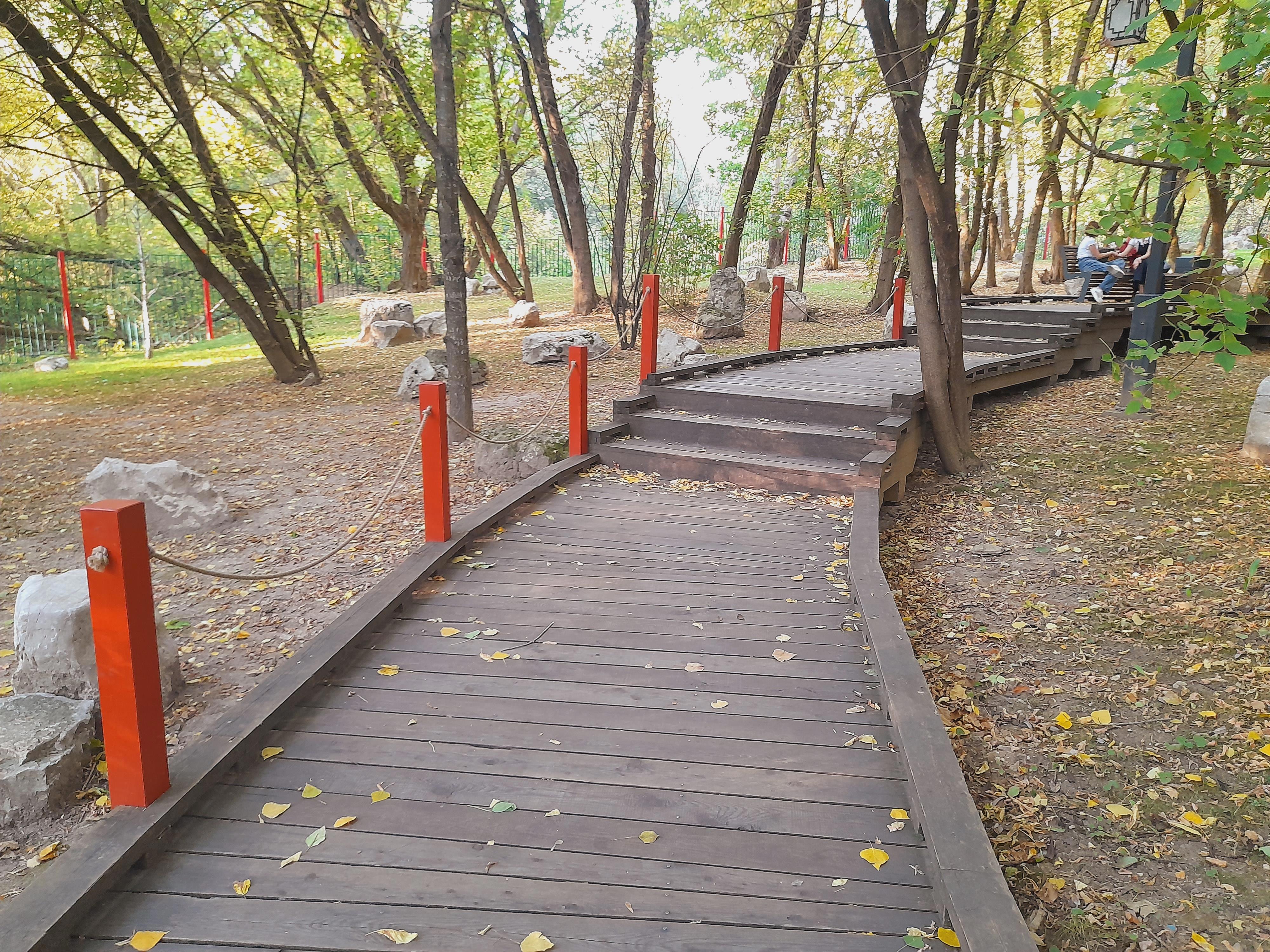 В парке три части -- центральная, где пруд и ручейки от него, лесистая, где проложены деревянные дорожки
