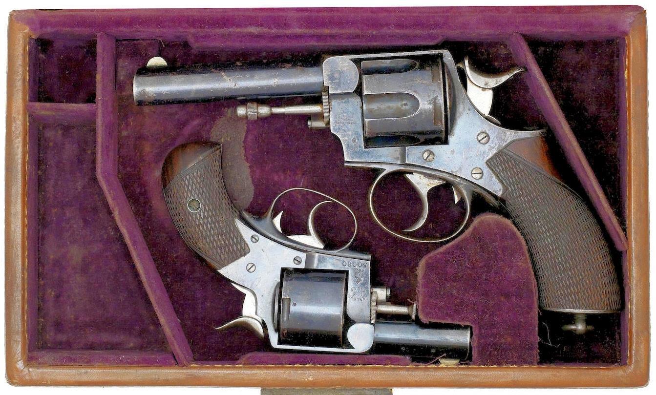 Короче трудно сказать не перечитывая, а мне лень что-то. Хотя я поставил бы всё же на «Веблей». Причина простая – предпочтения самого автора. После смерти писателя среди его вещей были найдены два пистолета. Это армейский A.476 Webley WG модель 1892 и А.38 ACP Кольт M1902. Вообще-то не факт, что Конан Дойль был владельцем этого оружия. Возможно, это были пистолеты его младшего брата – Джона Фрэнсиса Иннеса Хэя Дойла. Но факт интересный – опять засветился «Веблей», хоть и слишком молодой для персонажей сэра Артура. Да и крупноватые они для карманного ношения. Короче здесь всё же возможны варианты, но небольшие. Вот, например, была у продавцов интересная манера. Для тех, кто никак не мог определиться с выбором «поменьше» или «подальнобойнее», предлагали оба револьвера в одной коробке. Вот так: