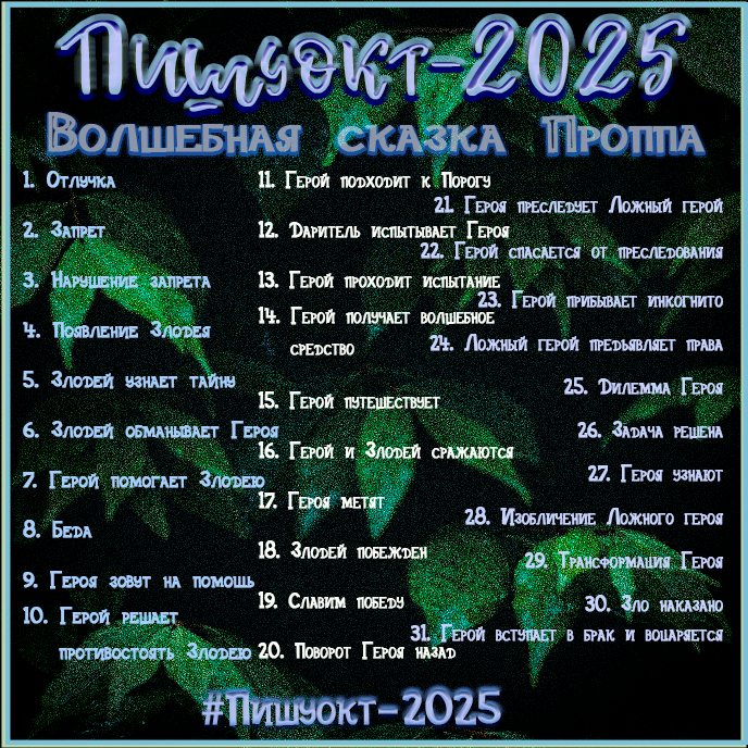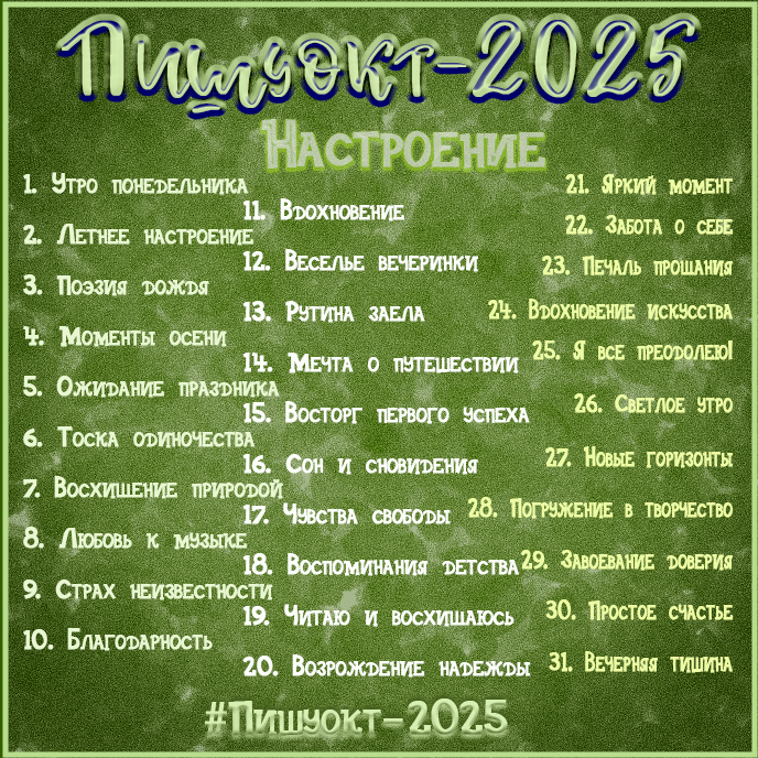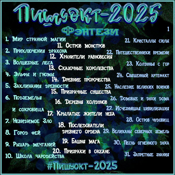 Все, кто одолеют хотя бы 16 тем любого блока, получат картинку "Участник Пишуокт2025". Те, кто сумеет к концу октября опубликовать все 31 главы, получат картинку "Победитель Пишуокт2025".