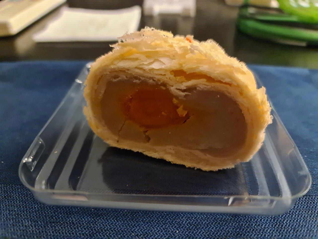 Паста семян белого лотоса - традиционный рецепт тысячелетий, эдакая зеленовато-желтая полупрозрачная, вязнущая в зубах полутвердая, полумягкая масса, что-то похожее на очень плотное виноградное желе, только облагороженное привкусом лотоса. Честно говоря, я семена лотоса никогда не жевал, но вот еще и паста из них… Сперва я не особо рвался, но потом распробовал. Это вкусно. Как я понимаю, популярность этой пасты связана не только с доступностью ее цены для пекарей, но и тем, такая паста хорошо переносит температуру при запекании наружной корочки.