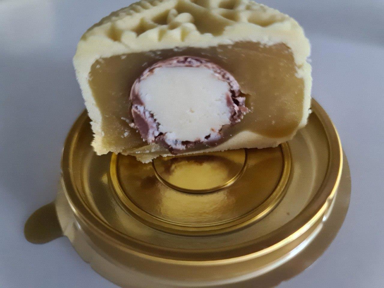 Второй по популярности тип мункейков – это фактически улучшенный вариант первого, или его брат: все та же паста лотоса, но уже с двумя солеными желтками («double salted egg lotus paste»). По цене, как ни странно, не отличается, но «желтколюбам» такой кейк понравится, естественно, больше: