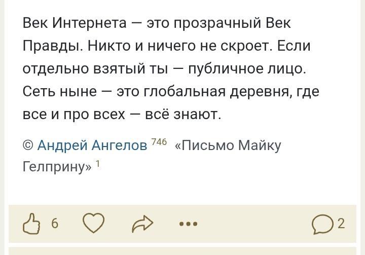 Автор: Андрей АнгеловВек Интернета — это прозрачный Век Правды. Никто и ничего не скроет. Если отдельно взятый ты — публичное лицо. Сеть ныне — это глобальная деревня, где все и про всех — всё знают.