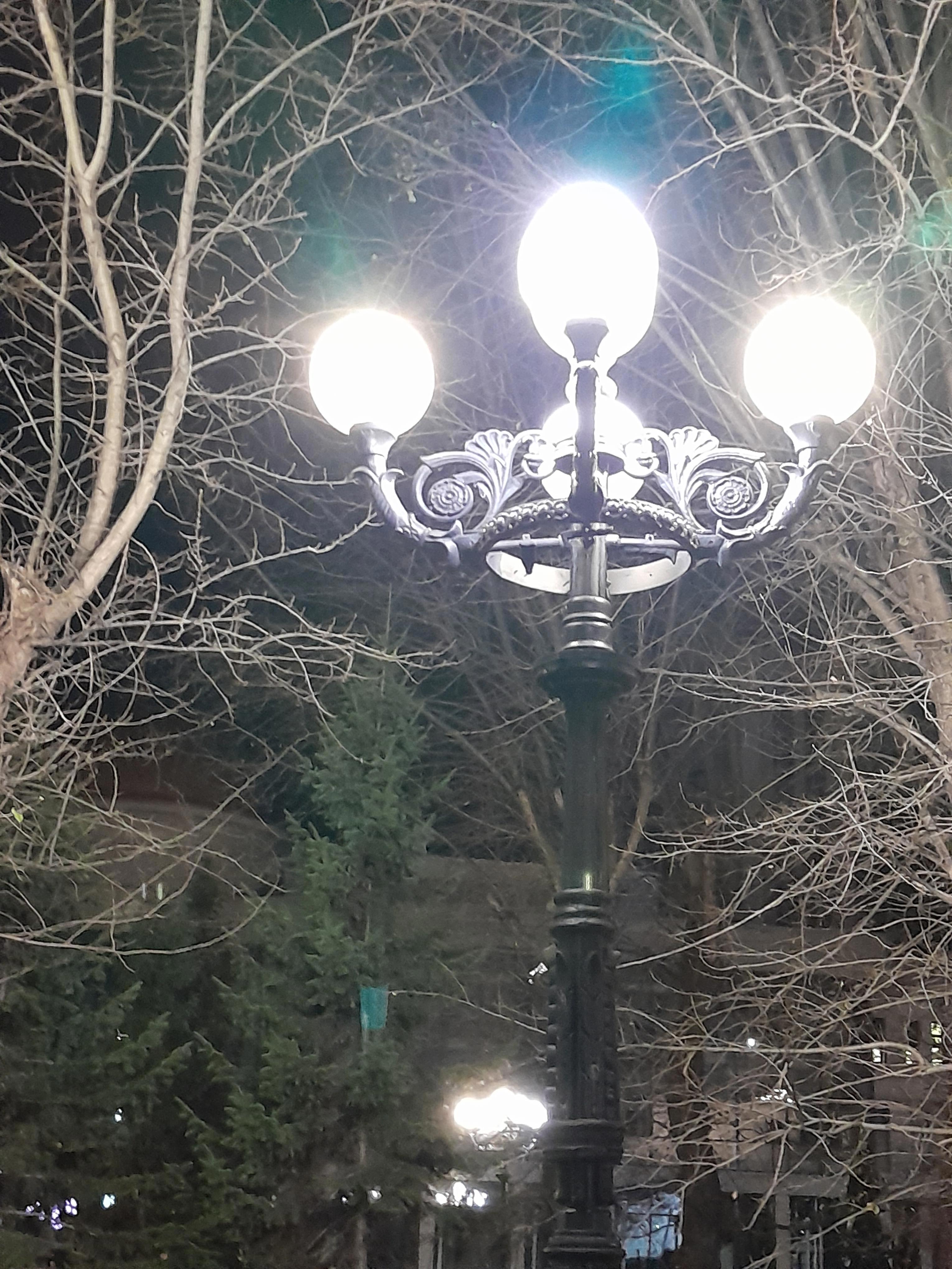 например, вот округлость фонарей и резкие ветки облетевшего тополя