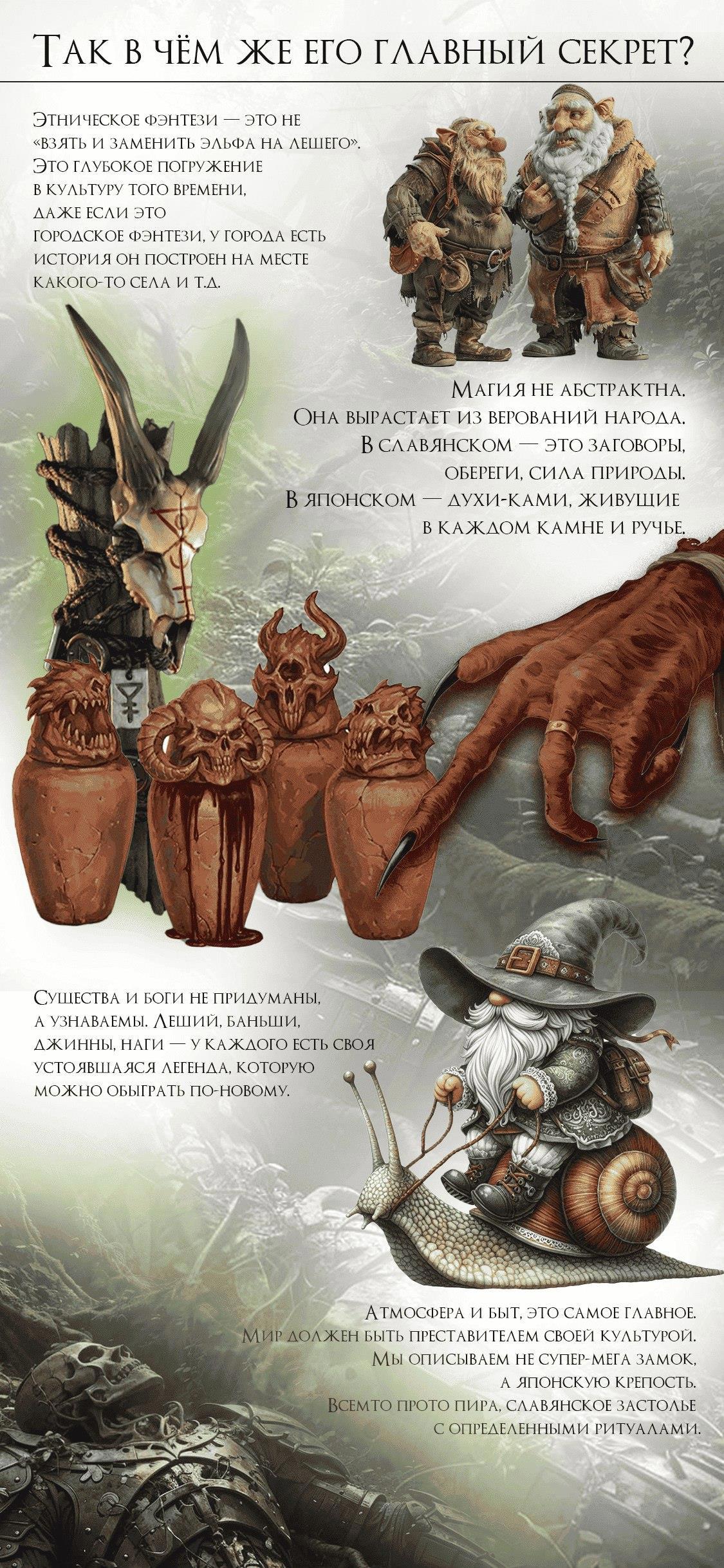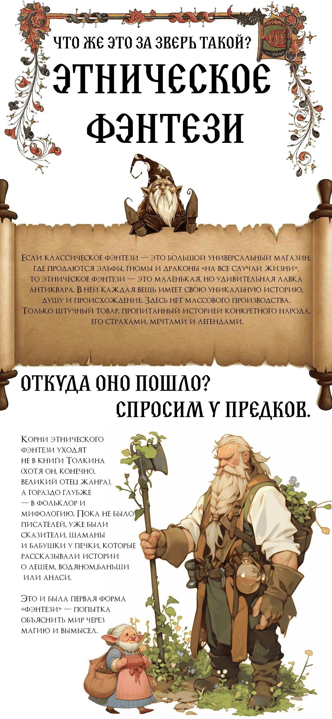 Автор: Волгина АнастасияДрузья, а ведь мир фэнтези, гораздо больше, чем эльфы, гномы и стандартные драконы. Прямо сейчас, под носом у каждого из нас, лежат целые пласты удивительных мифологий, которые ждут своего часа. Этническое фэнтези — это не «взять и перекраить Европу». Это возможность откопать своего уникального бога, монстра, магию, которая вдохновлено не пылью библиотек, а дымом кочевых костров, хвойной смолой или соленым ветром с фьордов.