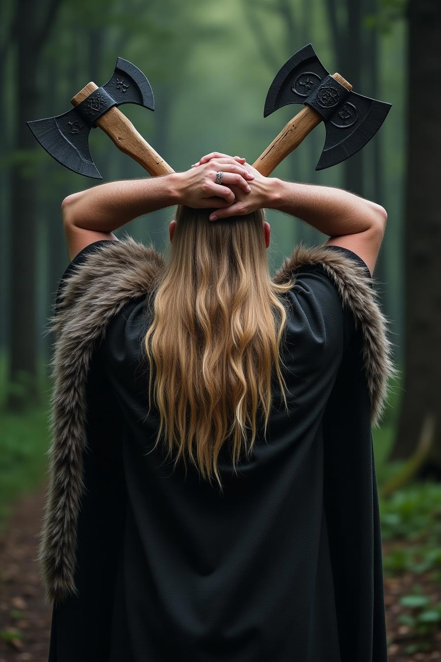 "А чё не так"? - как бы вопрошает нас ИИ этим своим творением, - "в промте указано crossed double-bladed waraxes, держи крестообразную двойную хрень, издали конструктивно схожую с секирой. Древко есть, crossed-like навершие есть - что не устраивает-то?"