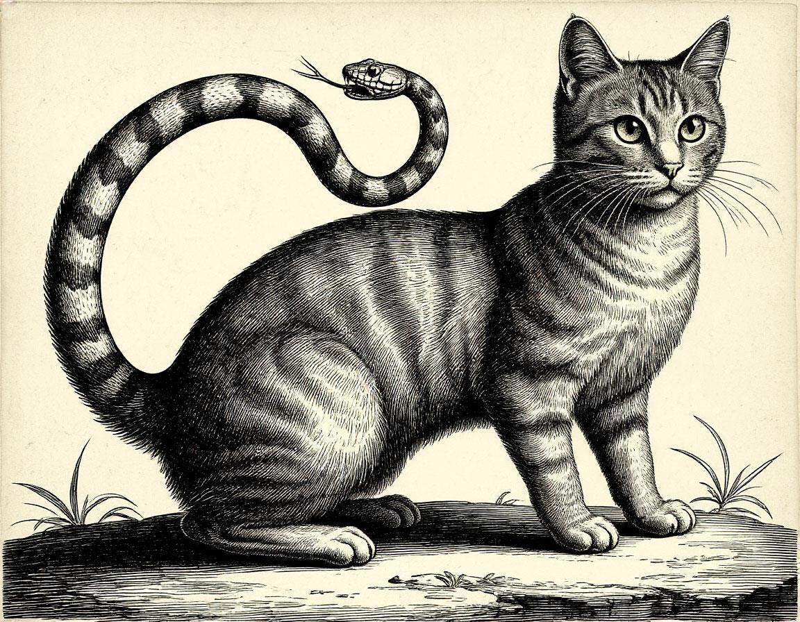 "Он говорит: "Кошки, они когда-то были змеями, и кошками стали, когда в очередной раз всё в мире переменилось. Поэтому их и убить так трудно, и вообще лучше с ними не связываться. Если ты кошку, скажем, обидишь, она может так тебя укусить или окорябать, что в кровь к тебе попадёт яд, тот самый, который у змеи в зубах". Он считает, что время от времени кошка сбегает в лес и превращается там в дикую кошку, и тогда на кончике хвоста у неё вырастает ещё один коготь..."