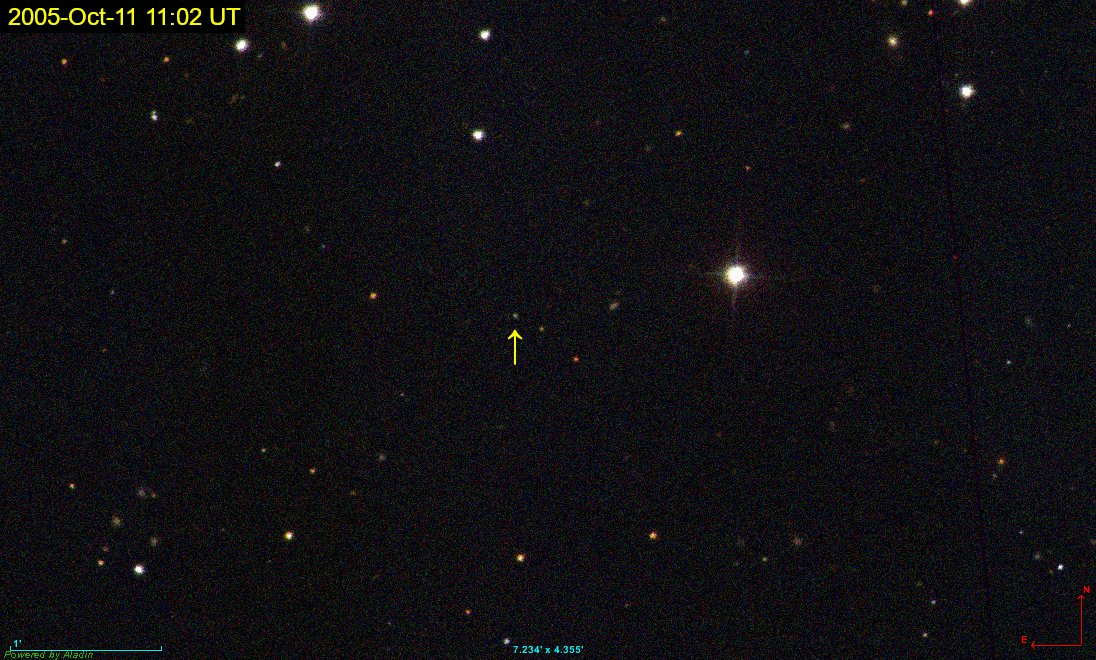 Седна, сфотографированная в цвете с помощью Слоуновского цифрового обзора неба обсерватории Апачи-Пойнт 11 и 12 октября 2005 года, демонстрирует медленное движение (подписана жёлтой стрелкой):