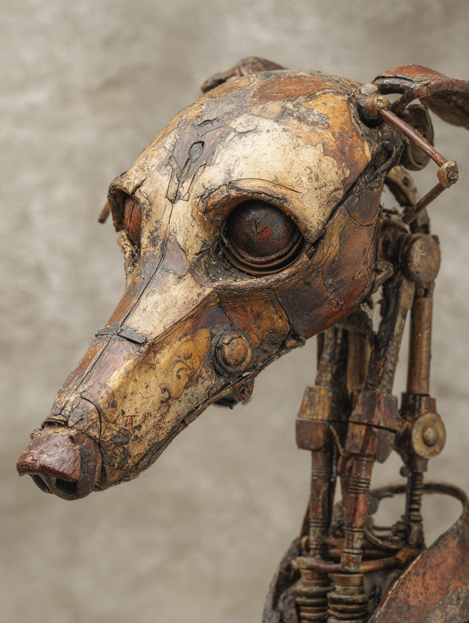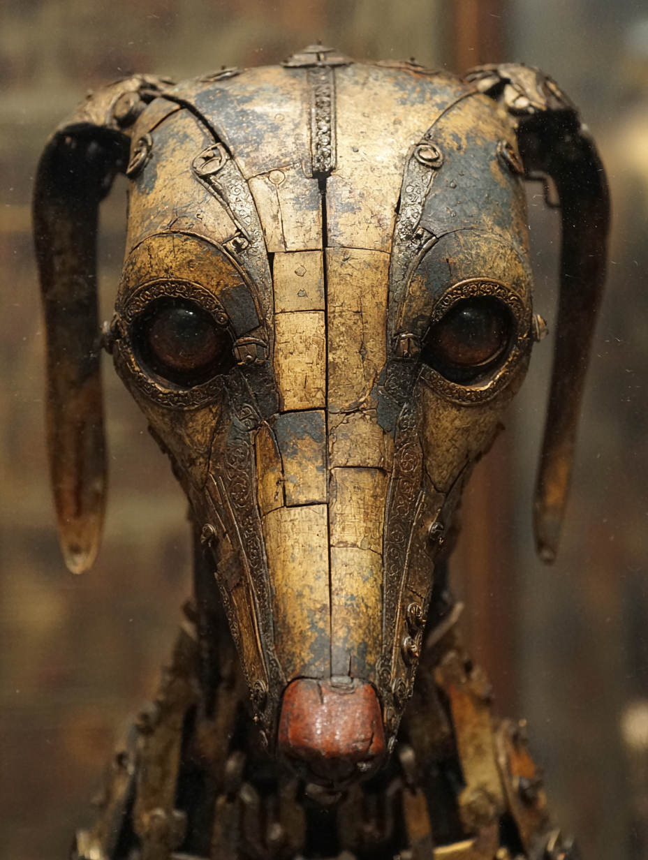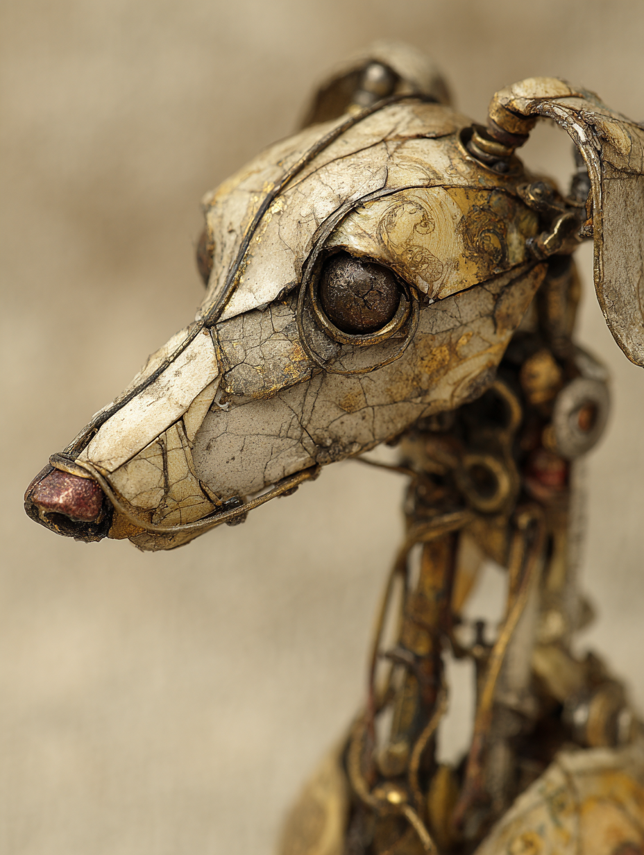 An automaton in the shape of an Italian greyhound, assembled from boiled bones and bronze joints. The skull is crafted into a canine head, with lively eyes, drooping ears, and a wet nose. A pink suede tongue protrudes from the mouth. Edwardian style. Style By Edmund Dulac --chaos 5 --ar 3:4 --profile iomhvnn --stylize 150