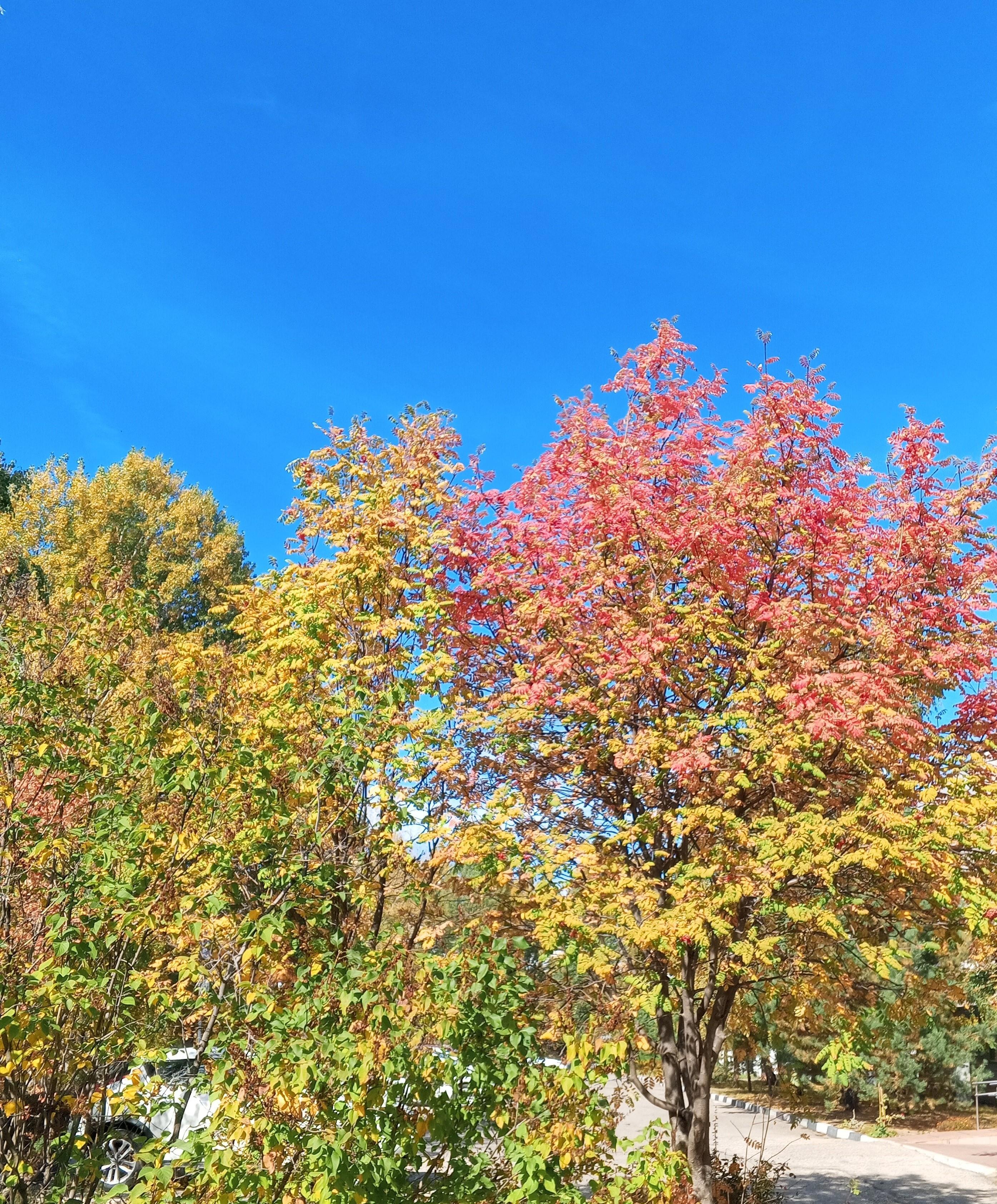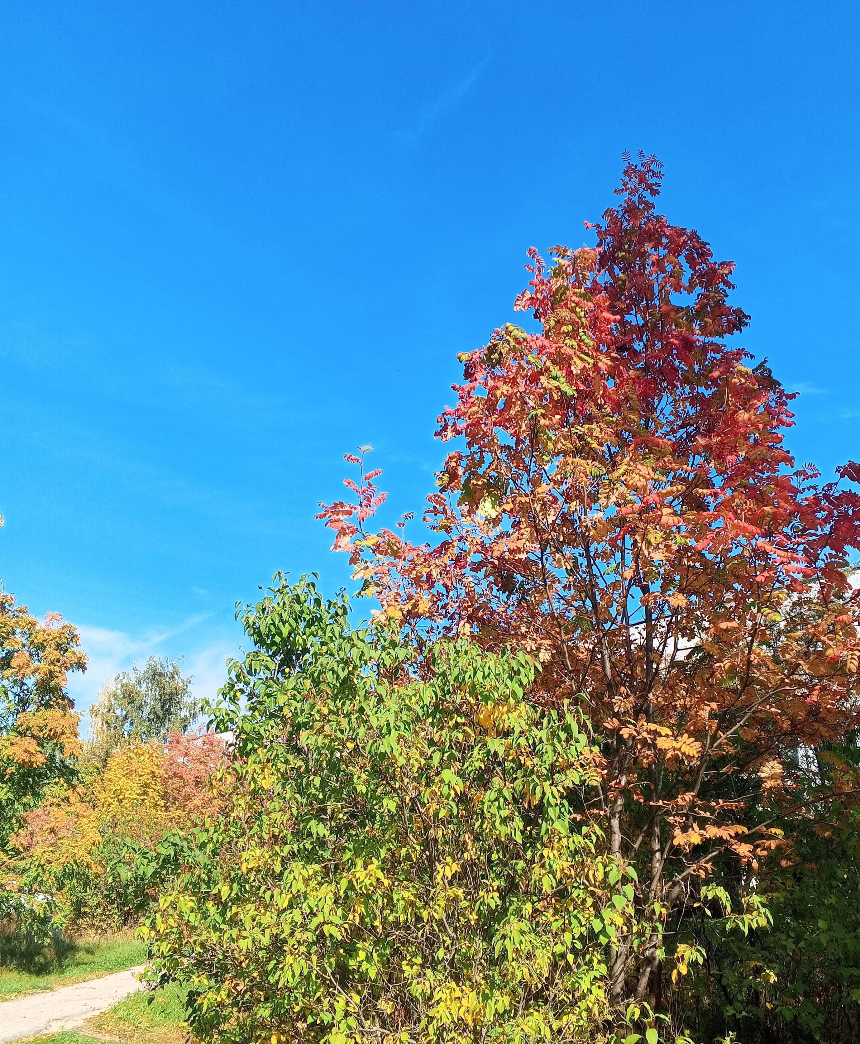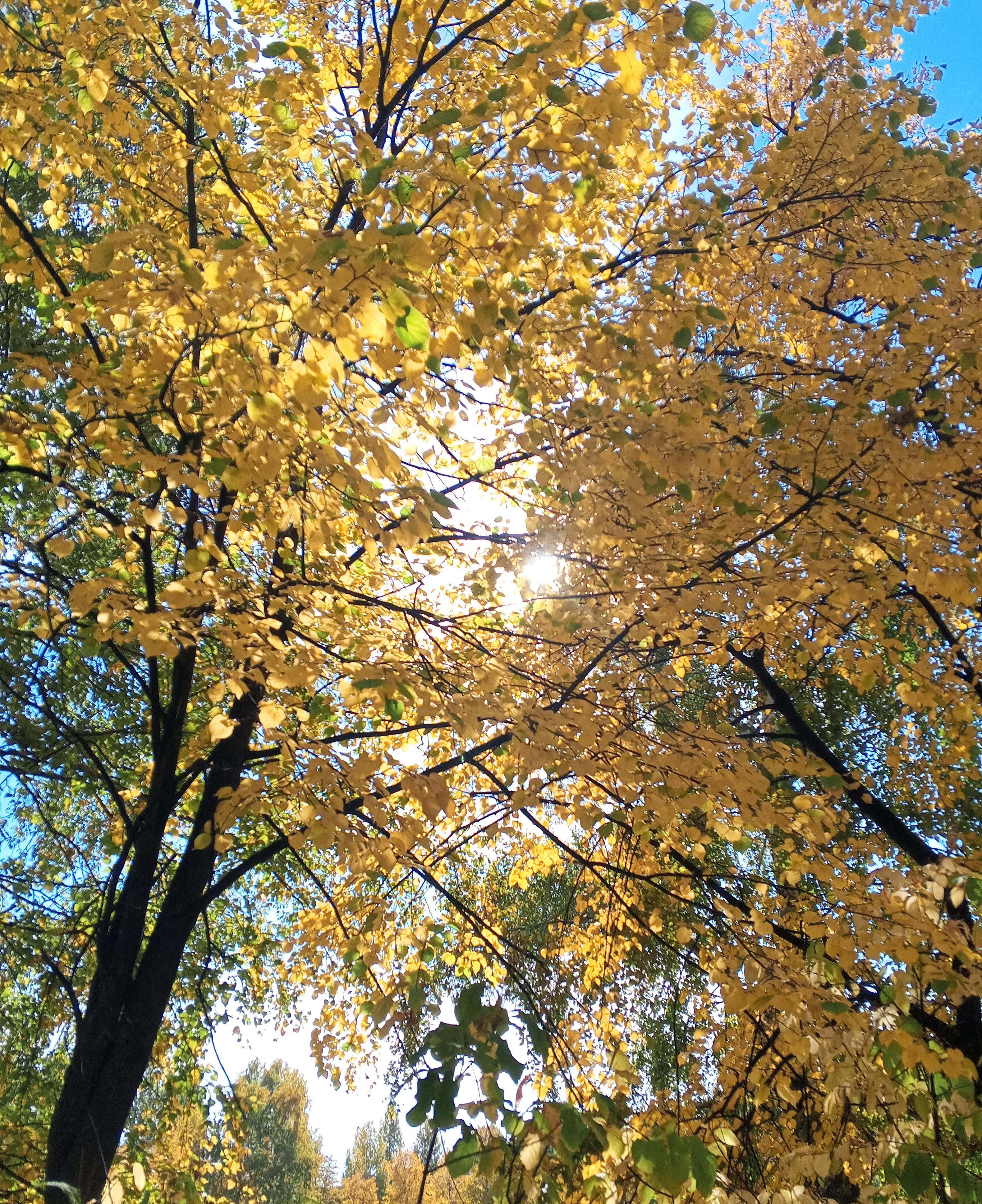 Солнце в сентябре низкое, несмотря на отсутствие облачности, и в какой-то дымке, словно закутано шарфом. Зато его можно фотографировать)) Небо же, наоборот, - ярчайшее, летом такого высокого синего неба не бывает.
