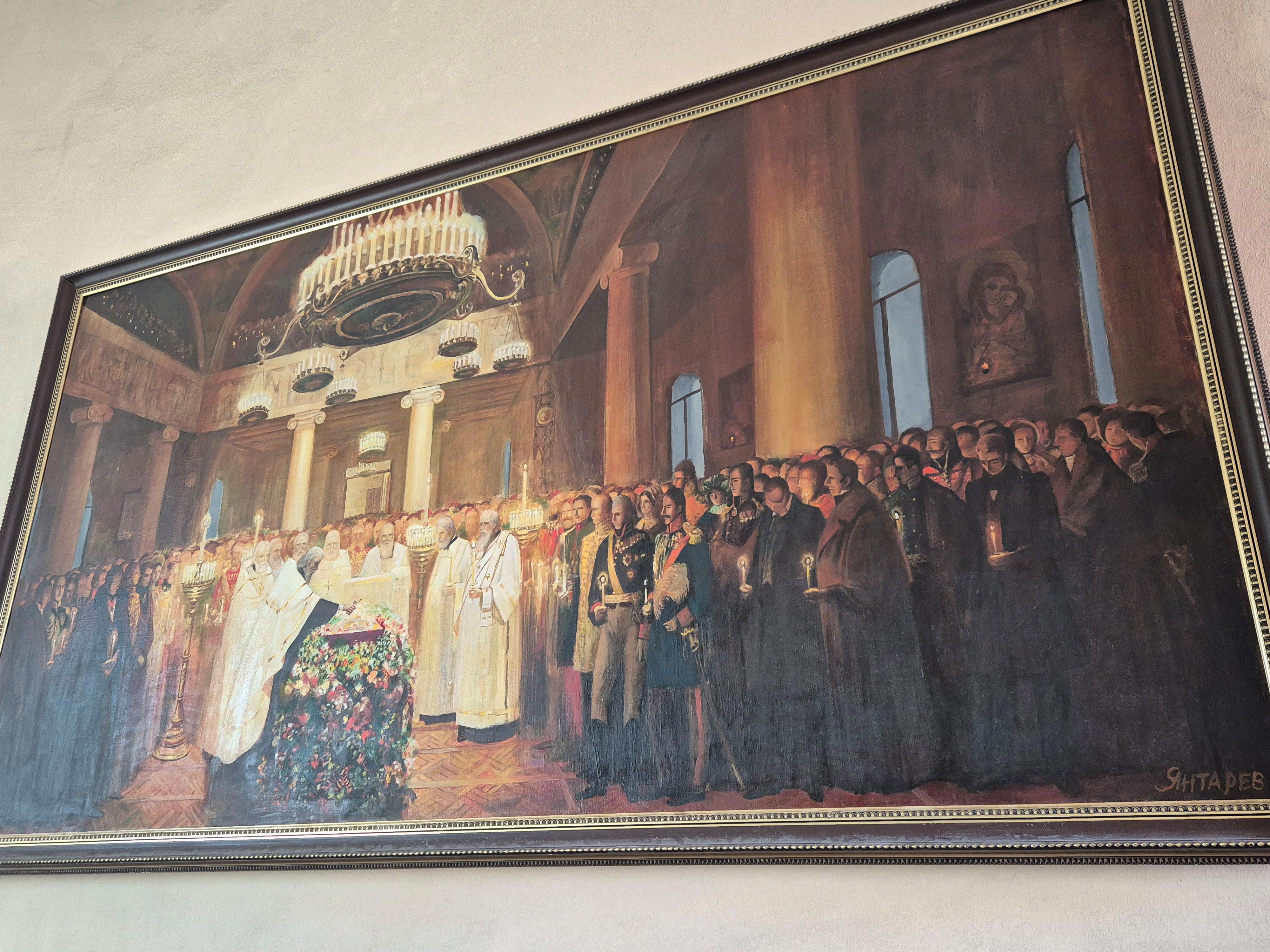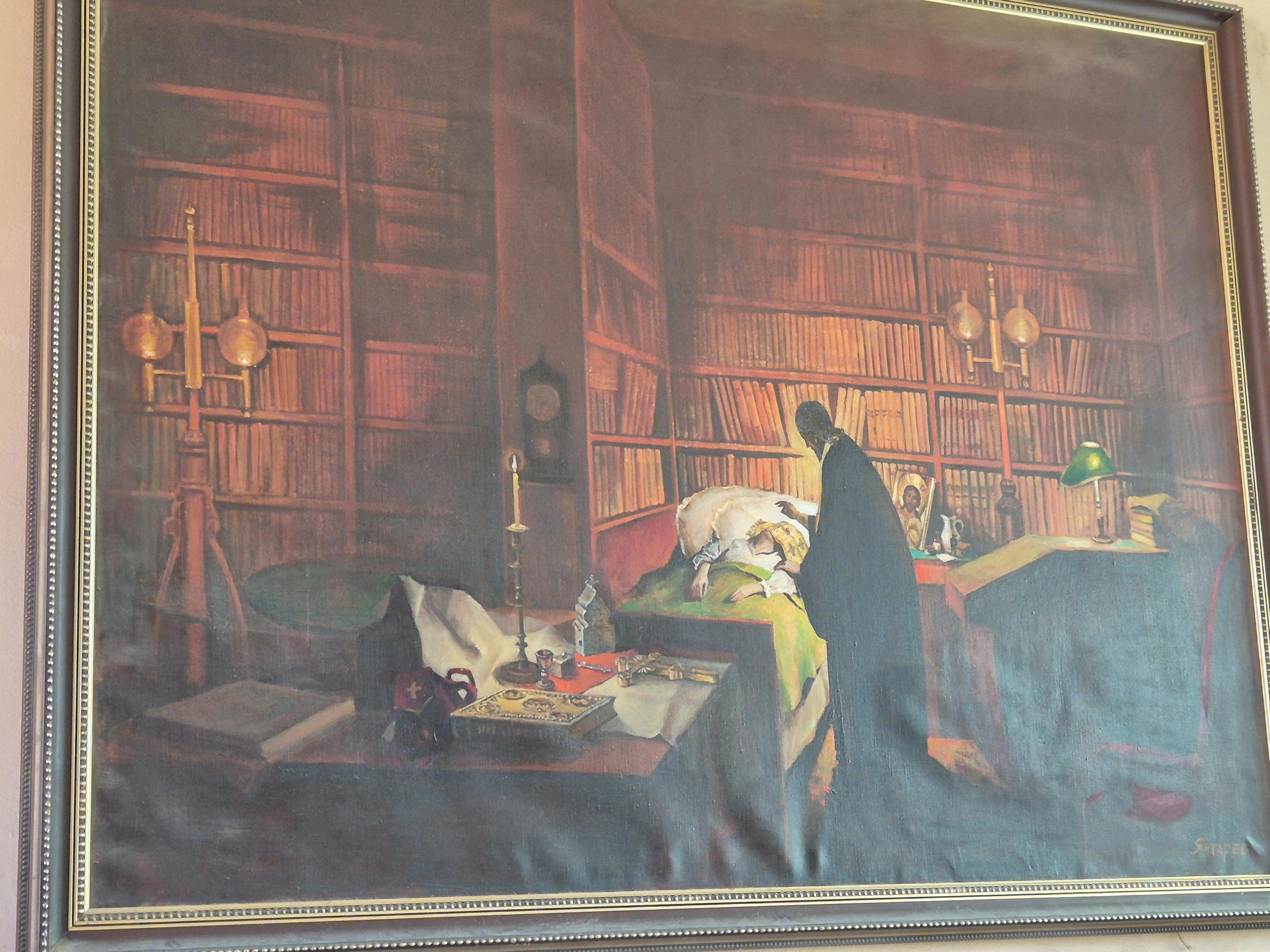 Я зашел в эту церковь. Старенькая, ветхая, действующая, расположена на втором этаже. А по пути на лестнице есть две картины: умирающий Пушкин в кабинете, и отпевание в храме.