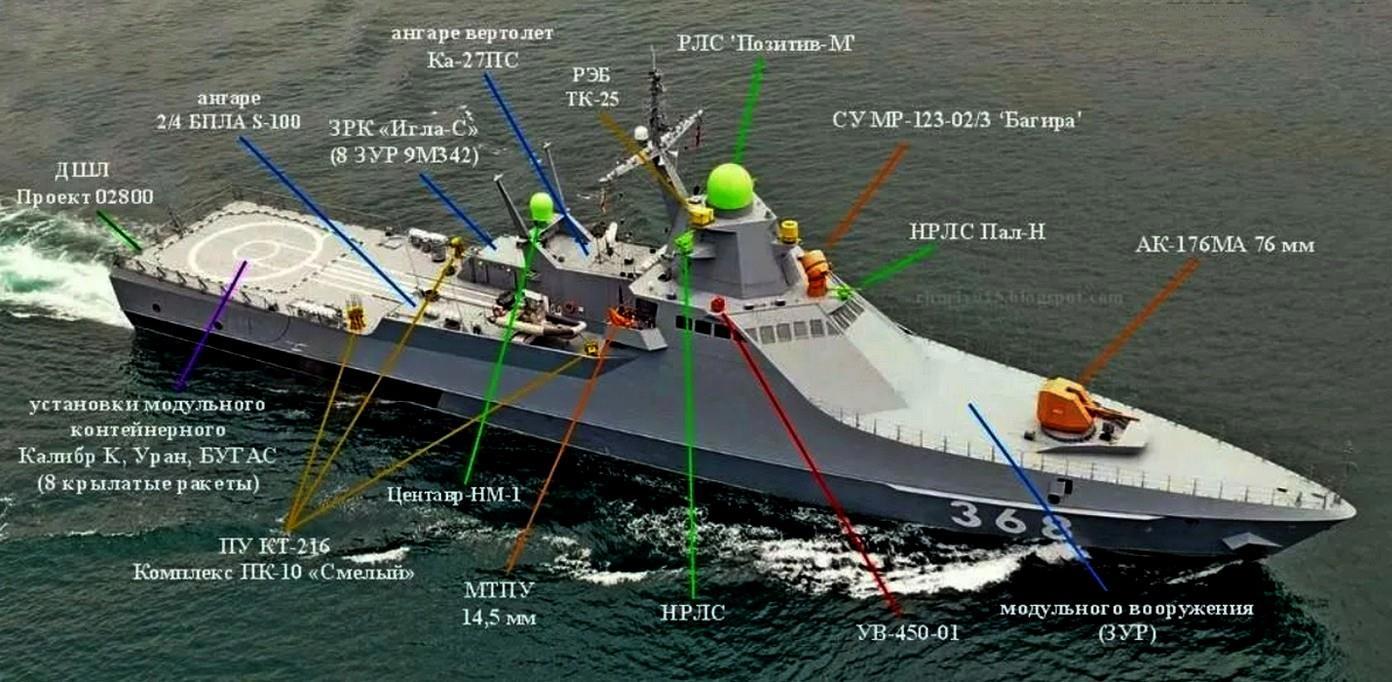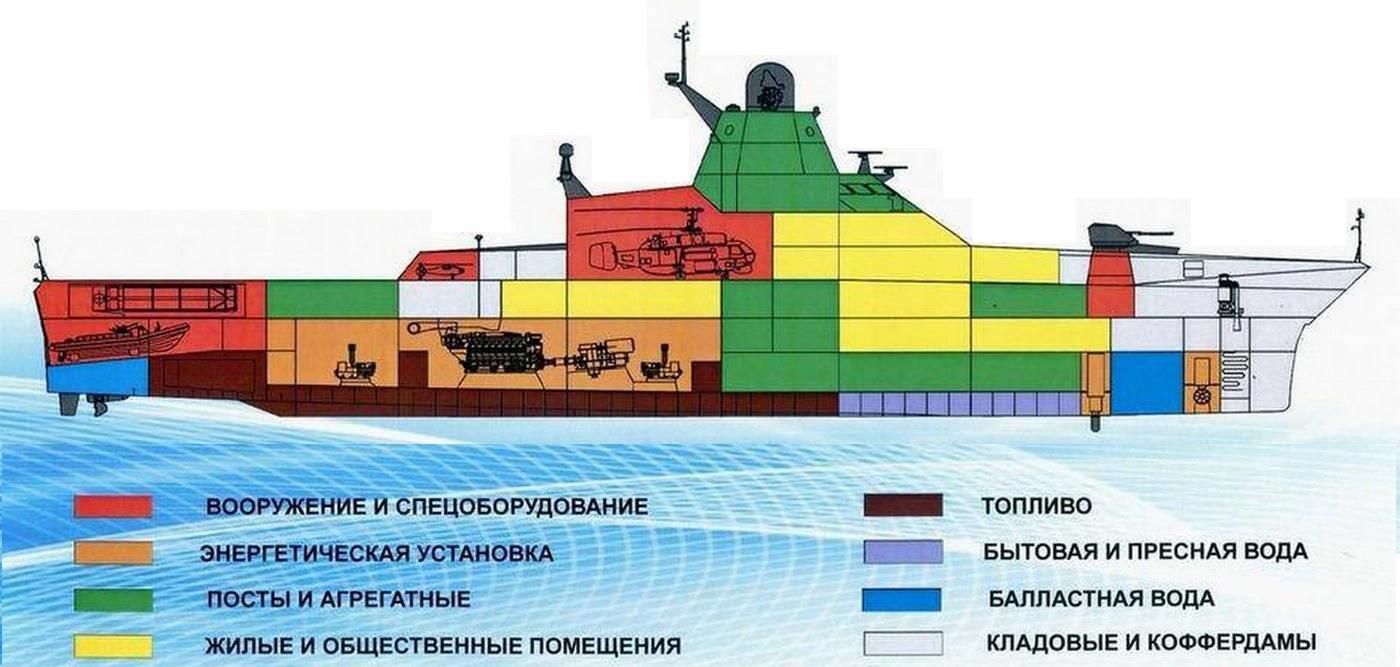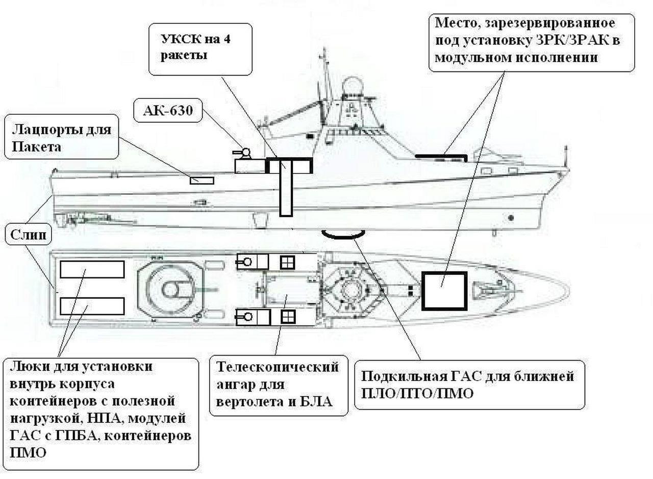 То, что я показал – вариант для иностранных покупателей. Это видно по тому, что здесь установлен комплекс ЗАК «Пальма», который является экспортным вариантом ЗАРК «Палаш». Но не это главное. Этот относительно небольшой корабль уже можно назвать «боевой платформой» именно потому, что его компоновка позволяет заменить отдельные элементы вооружения с учётом требований Заказчика.