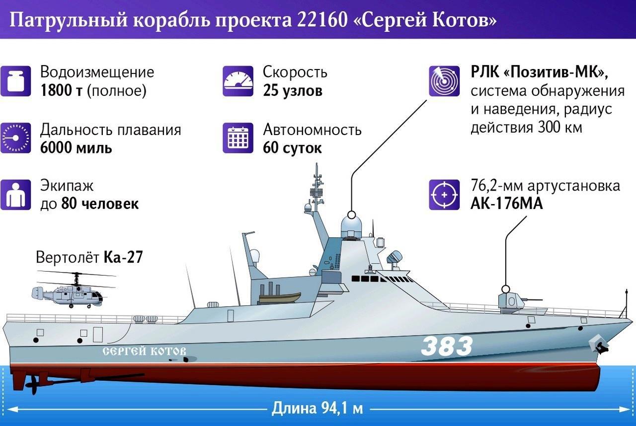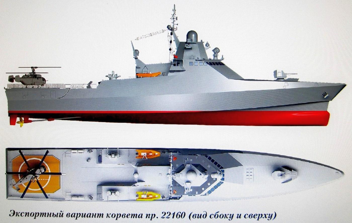 Однако, как говориться, «маловато будет». То есть что-то изменить можно, но сильно не развернёшься – при попытке переделать что-то, легко «упереться» в недостаток места или в характеристики мореходности. Поэтому более удобной «боевой платформой» можно считать кораблик немного больших размеров. Это корабли пр.22160. Нужно сказать, что когда появились первые данные про эти корабли, то на них от всяких наших и ненаших «военных аналитиков» обрушился просто шквал критики. Послушать – так там всё «не так». Я тогда эту критику читал, но вступать в какие-то споры (даже мысленно) не считал возможным. Во-первых, я не видел ТЗ и поэтому критиковать выполненную кем-то работу просто не считал правильным. Второе – информации было слишком мало.