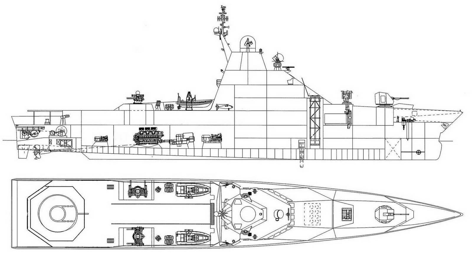 Так вот… несмотря на свои относительно небольшие размеры, общая компоновка позволяет на этой базе сделать корабль для борьбы с крупным соединением боевых кораблей, установив на него до 16 мощных противокорабельных ракет. При этом он сможет самостоятельно вести разведку на больших дистанциях в сотни миль. Для этого его можно оснастить вертолётом и беспилотниками. Можно использовать в качестве корабля для «специальных операций» - у него есть кормовой отсек для десантно-штурмового катера и место для установки скорострельного морского орудия калибром 57-76-100 мм. При этом корабль может неплохо защитить себя сам от атак из-под воды, с поверхности или с воздуха.