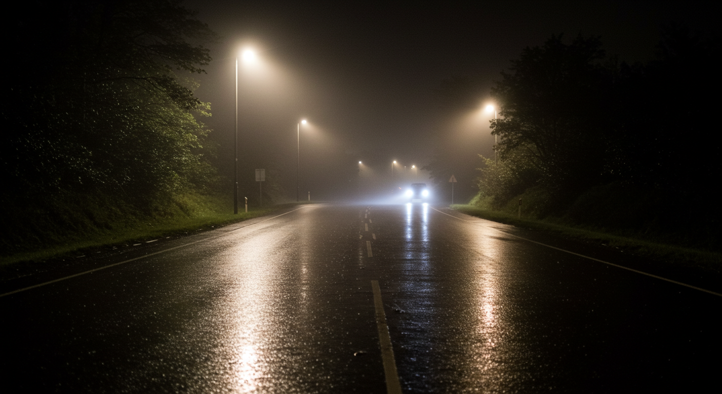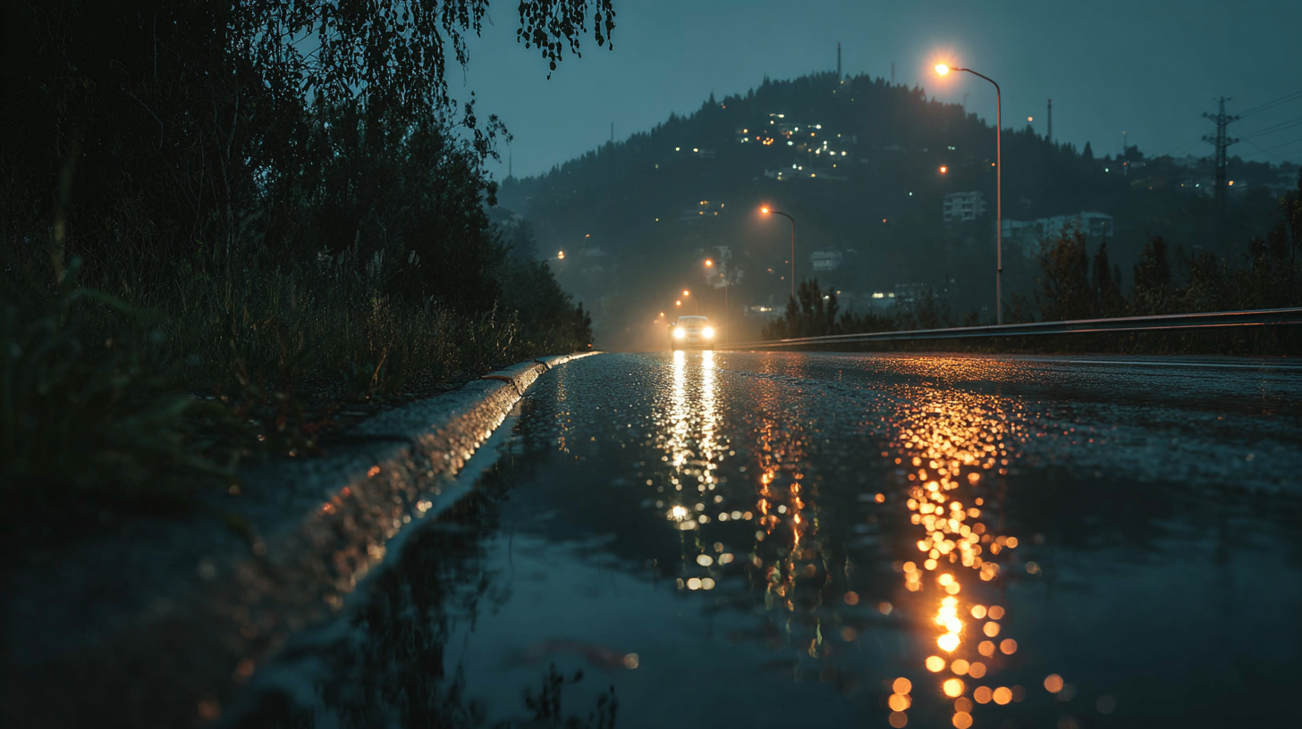 Мокрый асфальт отражает огни, из-под земли поднимается пар, вдалеке стоит машина с фарами.