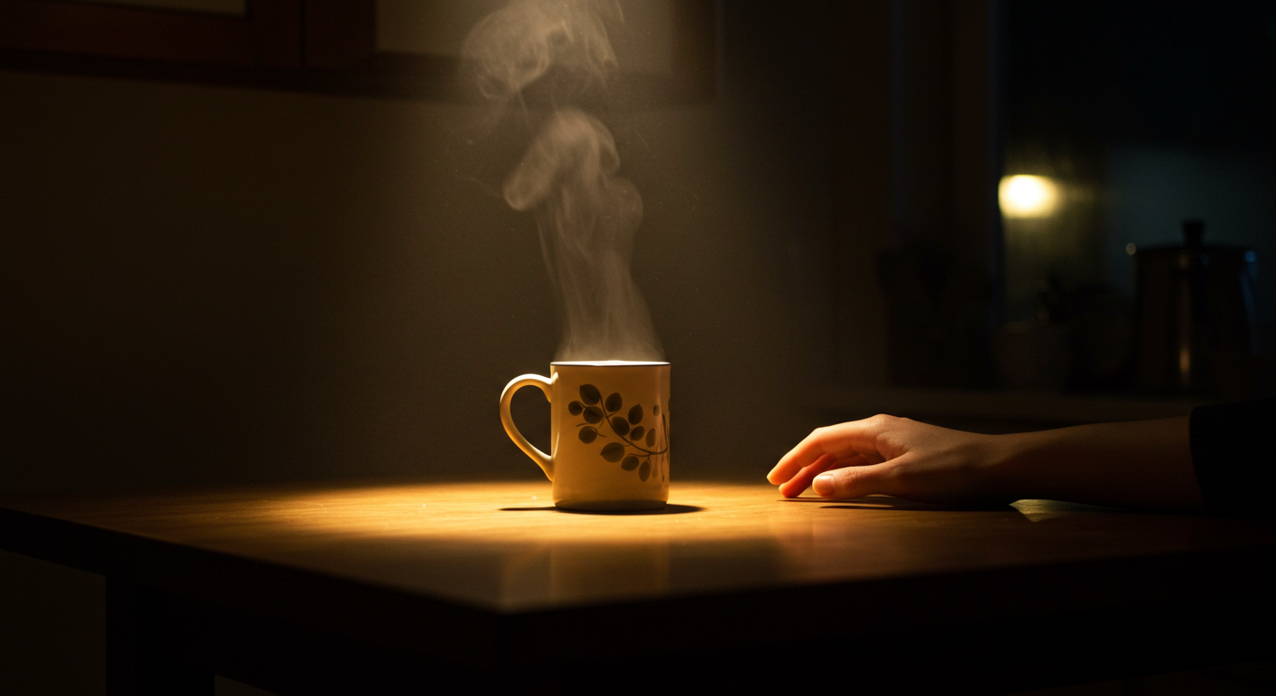 Лампа, кружка с паром, рука на столе.