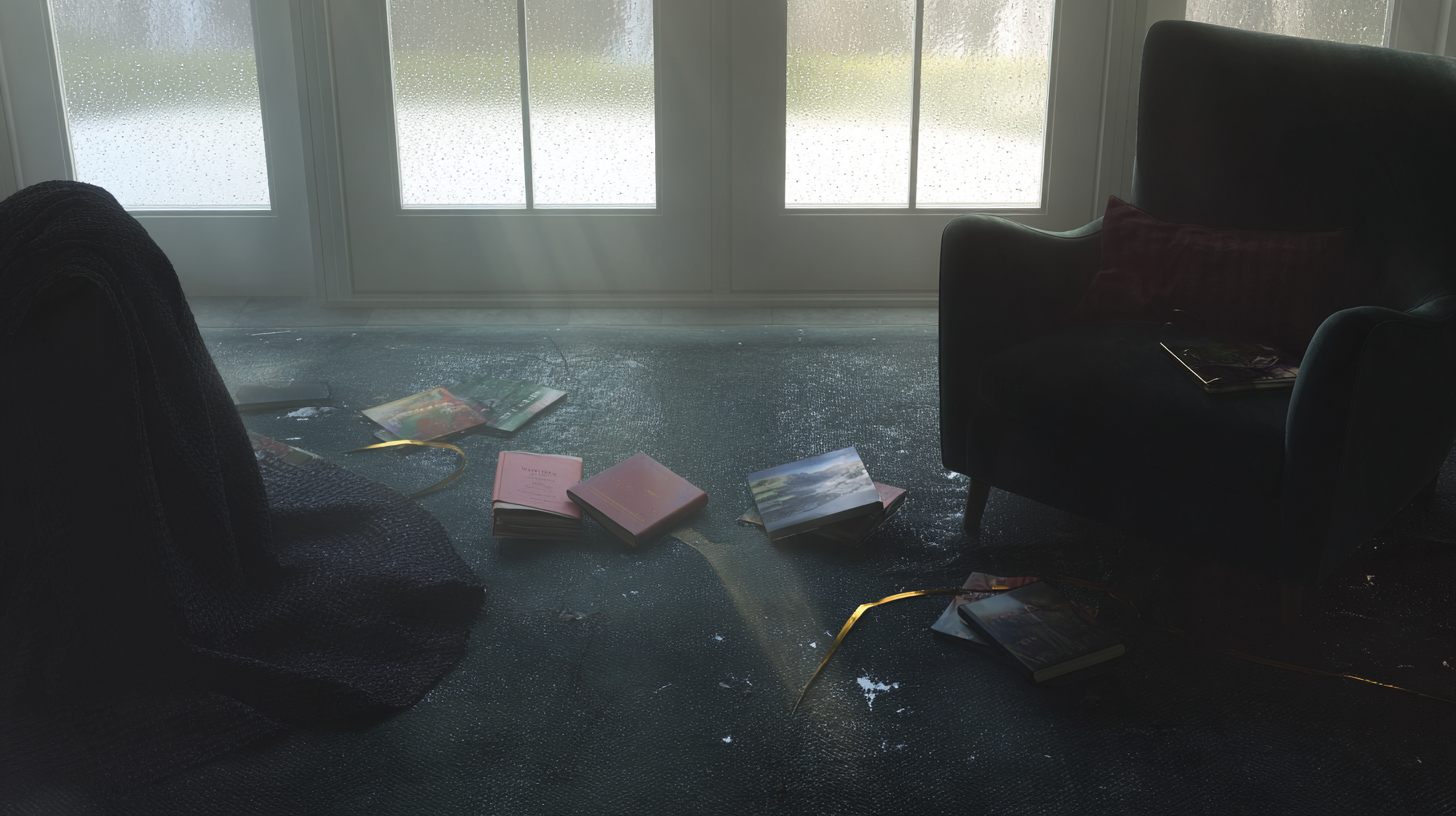 Сбитый плед, книги на полу, пустой стул у окна, за стеклом — дождь.
