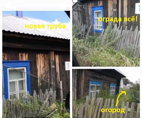 Рис. 32. Коллаж: дом, которому 65 лет – всё ещё стоит. Покрашены ставни, поставлена новая труба. Но ограда сильно порушена, огород заросший. Лето 2025 г.