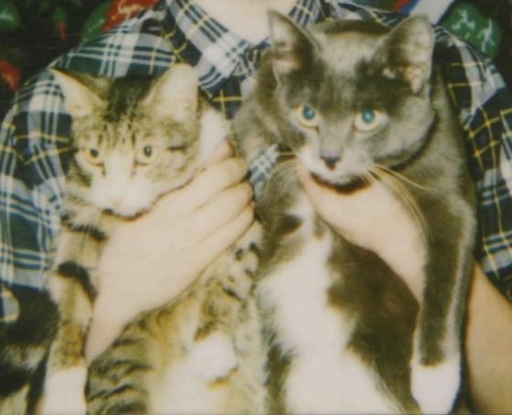 Рис. 16. Васька и Мурзик (справа) – кот с диковинными глазками цвета морской волны. Съёмка на мой «Полароид», 1998.