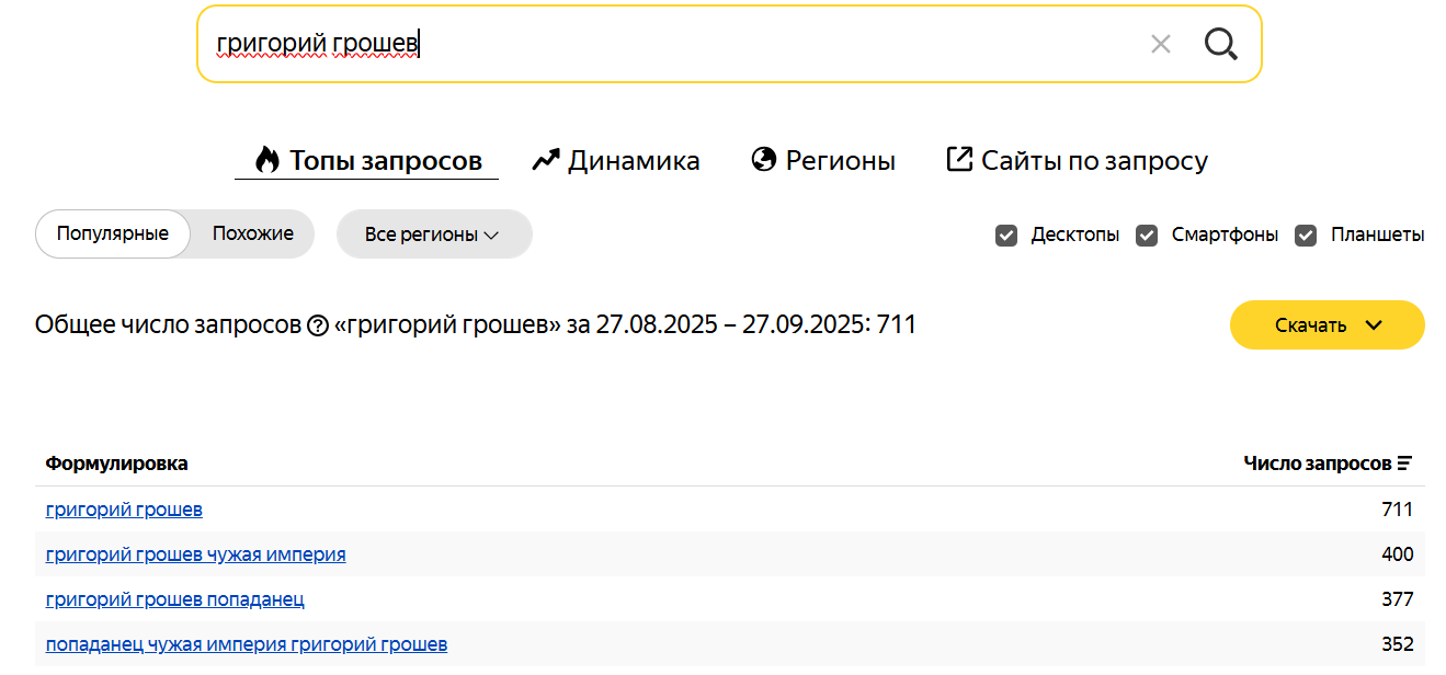 Итог: роман "Попаданец. Чужая империя" принёс мне КС, локальную популярность, а ещё - некоторую сумму дохода. Не то, чтобы много, но благодаря регулярным продажам на ключевых сайтах самиздата меня стали воспринимать всерьёз. Книгу активно ищут в интернете (это Яндекс.Вордстат):