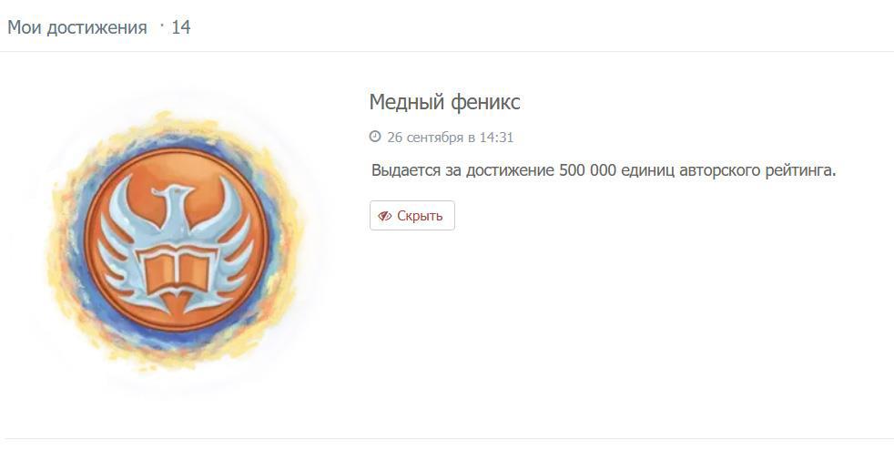 Автор: Василий КленинЯ тут заработал медного феникса) Полмиллиона авторского рейтинга - звучит неплохо, если не заглядывать на первую страницу авторского топа) И на вторую... И на пятую((