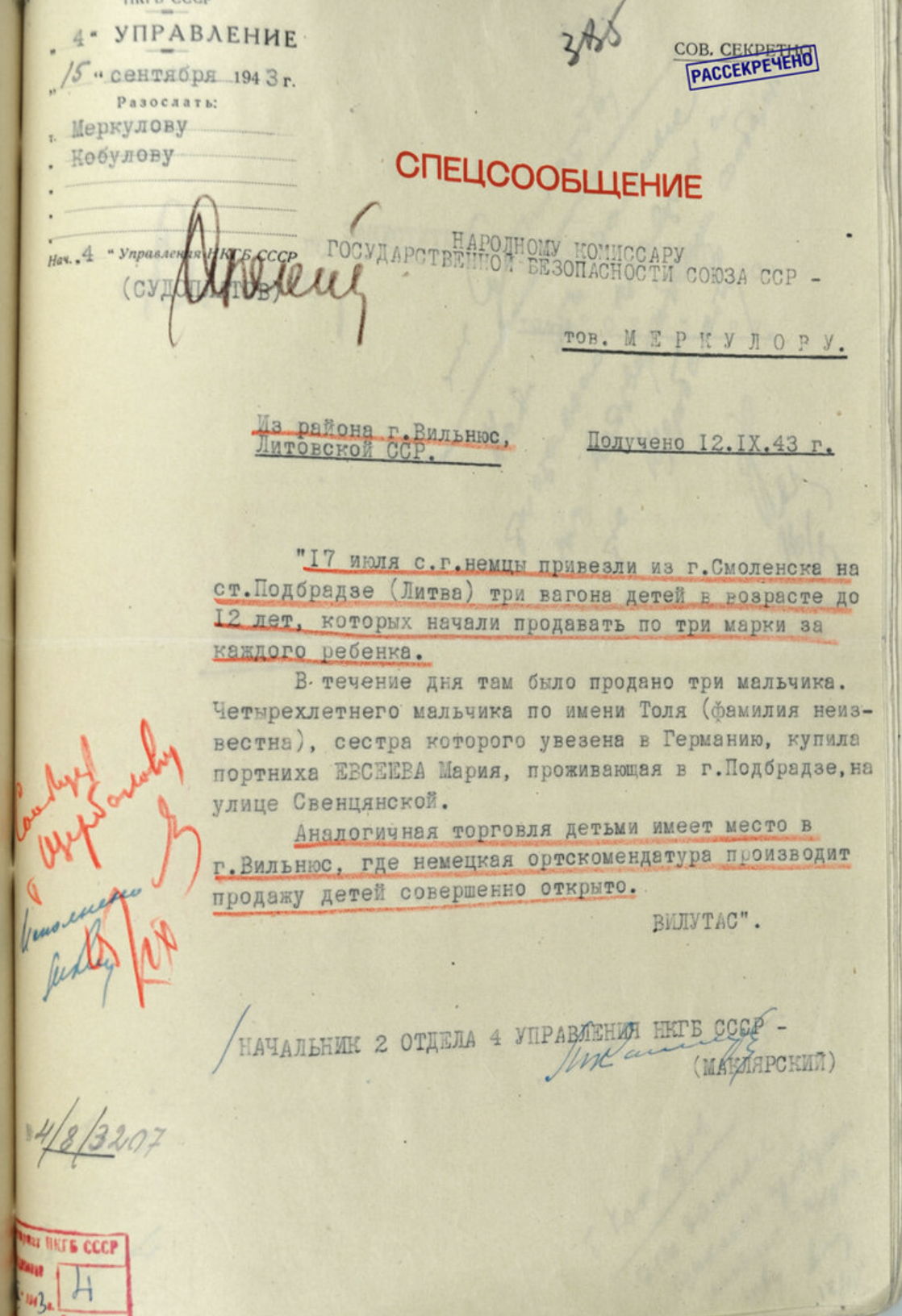 Спецсообщение 4-го Управления НКГБ СССР наркому государственной безопасности СССР В.Н. Меркулову о торговле детьми, вывезенными немецкими оккупантами из г. Смоленска (15 сентября 1943г.)