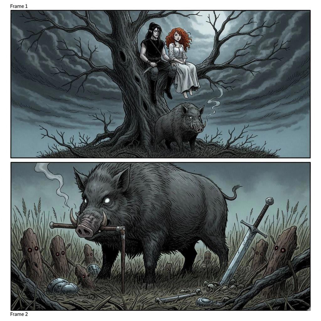 С убиением кабана начались сложности. Шед рисовал что попало, а потом вообще отказался рисовать убитого хряка.