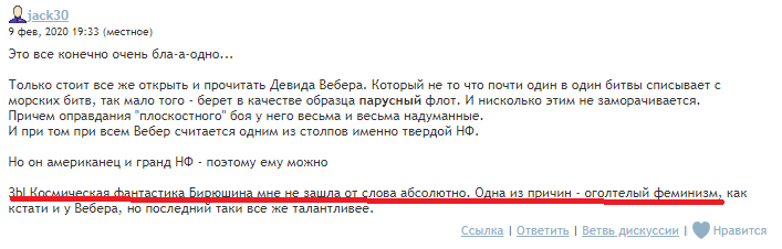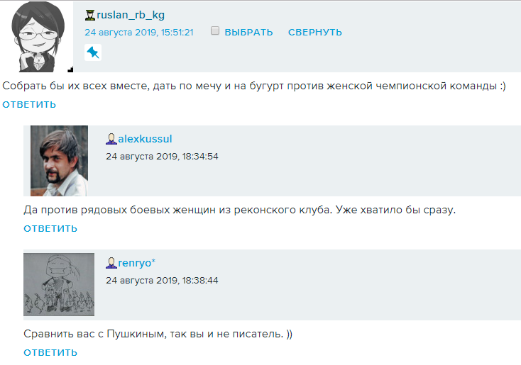 Если же вы хотите резко оборвать пошедший по нежелательному для вас сценарию диалог, просто решительно заявите, что автор - баба. Если автор и вправду женщина, скажите что он мужик, кроющийся под женским псевдонимом - так выйдет даже позорнее для противника.