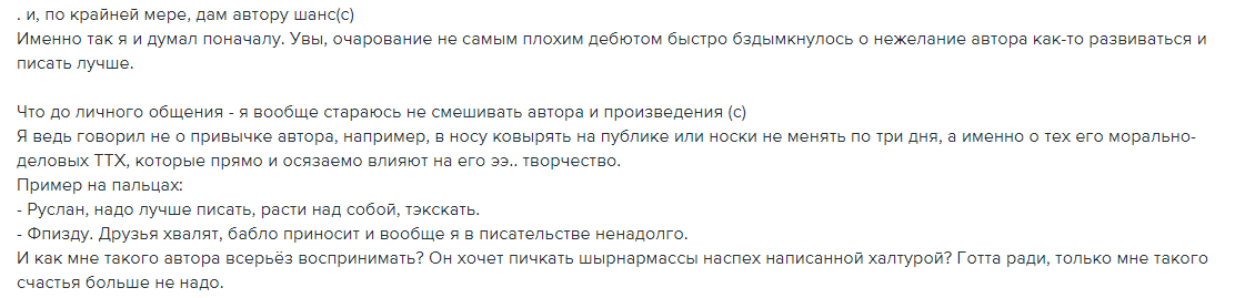 Не давая оппоненту времени опомниться, начинайте искать причины того, почему ваш оппонент плохо пишет. Причины слабостей в творчестве оппонента как можно быстрее сведите к личности оппонента. Это второй обязательный пункт. Например, укажите, что автору бабы не дают. Разумеется, желательно облачить это в достаточно пристойные формулировки (чтобы не словить бан, если дискуссия происходит в месте, где модер и админ - не вы сами).