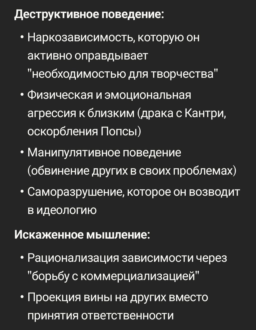 В общем, вместо стандартного положительного или же отрицательного героя мы получаем просто поехавшего, но всё-таки не безнадёжного. Это тяжёлый клинический случай, но если он и поправится, то только по собственной прихоти, потому что диагноз «рок-н-ролл» неизлечим.