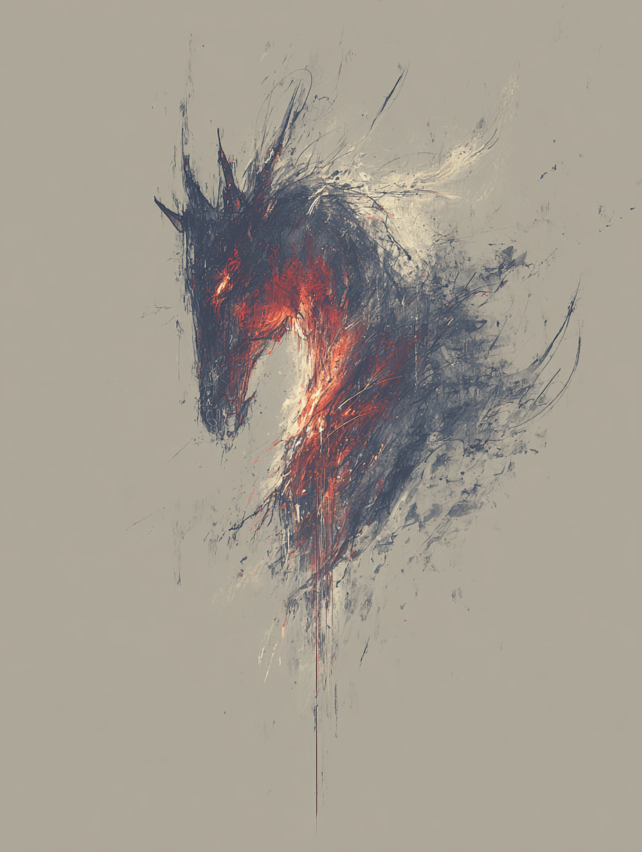 demonic horse that breathes fire. Abstract. Elegant. Luxurious. Minimalist. Artistic. Vector motif --chaos 5 --ar 3:4 --sref https://s.mj.run/Tp19GRnX4aM --profile iomhvnn --stylize 150