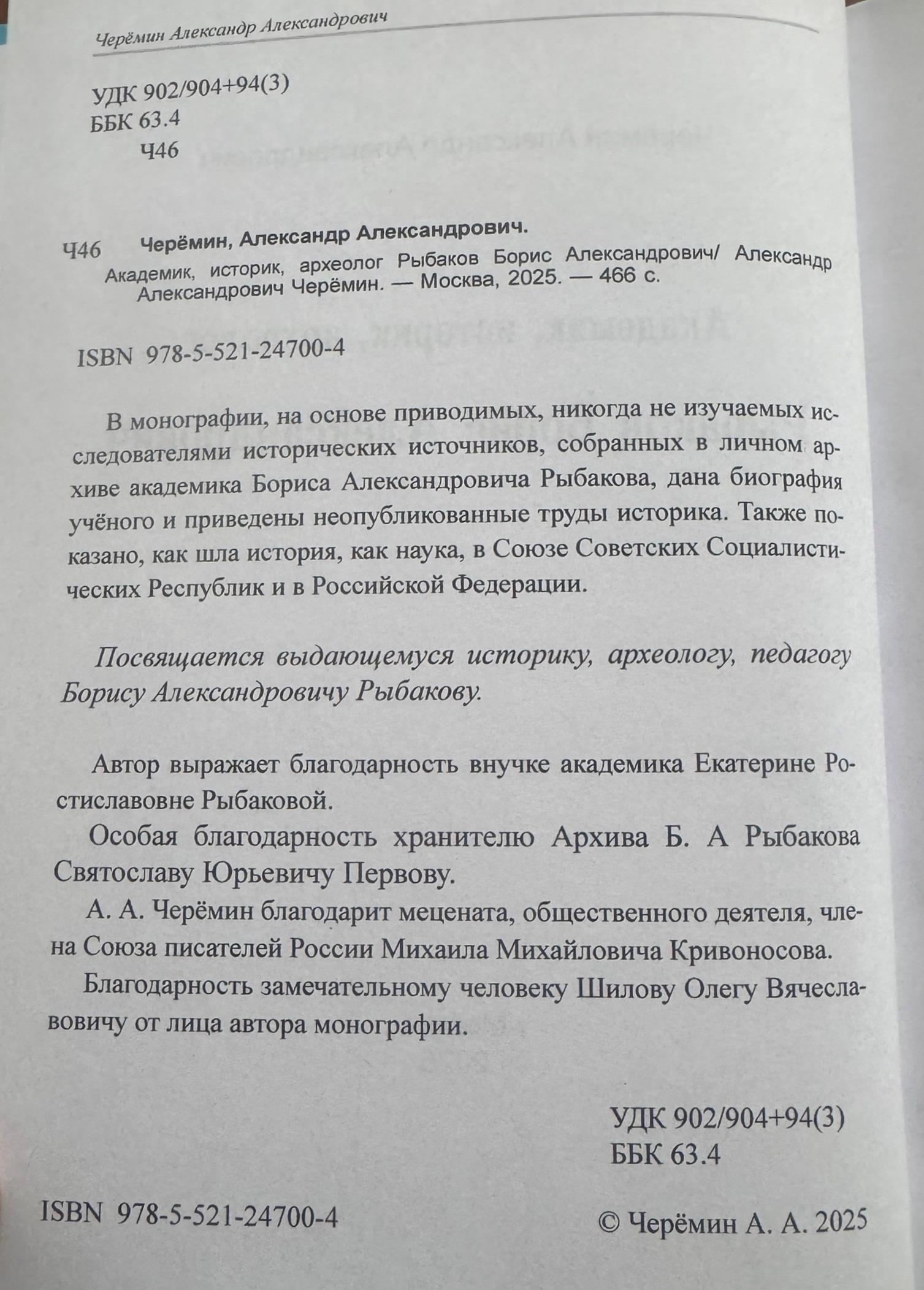 Вот и дождались. Только что вышла из типографии долгожданная монография историка Александра Александровича Черёмина «Академик, историк, археолог Рыбаков Борис Александрович»