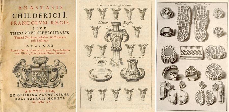 Но забыли, что есть власть выше их — наместник испанских Нидерландов Леопольд-Вильгельм Габсбург. Он забрал обе части сокровища. Но еще в ходе откапывания могилы врач и антиквар Жан-Жак Шифле сделал полное описание сокровищ, зарисовал их и выпустил книгу о находке — "Anastasis Childerici I. Francorvm Regis, sive Thesavrvs Sepvlchralis Tornaci Neruiorum", т.е. "Воскрешение Хильдерика I, короля франков, или Погребальные сокровища в Турне". Эту работу можно рассматривать как первую монографию по археологии в Европе. И надо сказать, она сыграла огромную роль в этой истории. Хотя бы для того, чтобы подтвердить, что все замечательные вещи действительно были извлечены из могилы Хильдерика (в XIX веке в этом начали сомневаться). Но не только для этого.