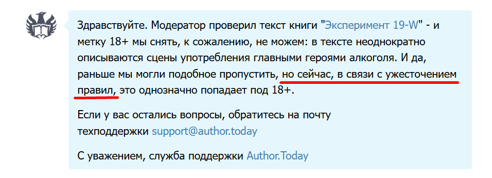 1. Вопреки ожиданиям, что процесс растянется на 6-8 месяцев, за мои книги редакция АТ взялась довольно быстро, и 7/10 уже были отсмотрены. С трех метку 18+ сняли, с остальных — нет и, к чести техподдержки, во всех случаях мне даже дали объяснение, почему (что в целом, как я понимаю, опционально с их стороны). Что ж, и то хлеб.