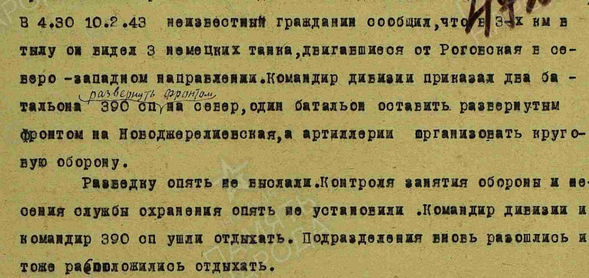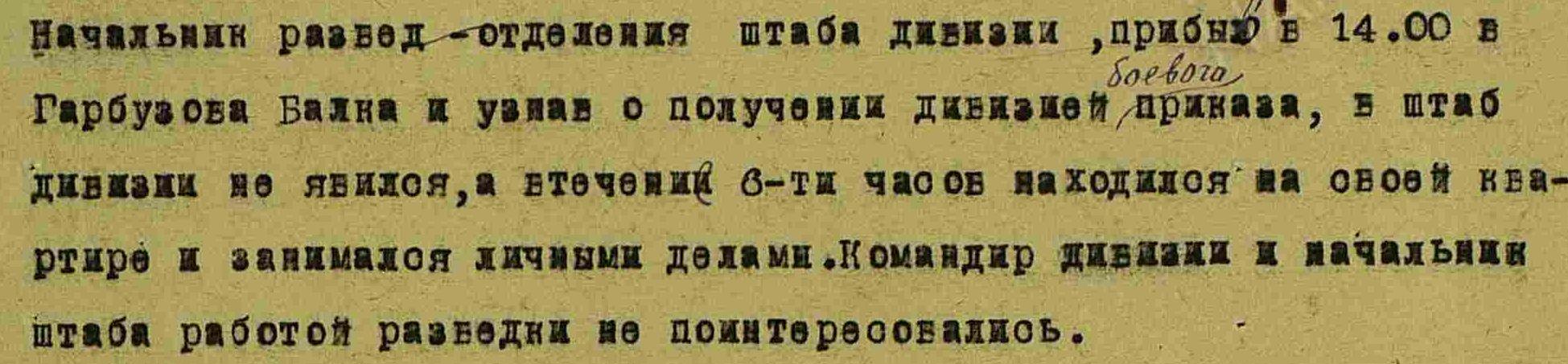 Начиная с командира дивизии и кончая командиром отделения, никто боем как следует не руководил. Разведка не велась. Охранение не организовывалось. Связь не поддерживалась. Исполнение приказов не проверялось. Приказ тов. СТАЛИНА 1942 г. № 229 о принятии самых суровых мер для восстановления нарушенного в бою порядка не выполнялся. Начсостав в подавляющем большинстве не только не обеспечил устойчивость войск в бою, но и сам проявил трусость и бежал вместе с бойцами.»