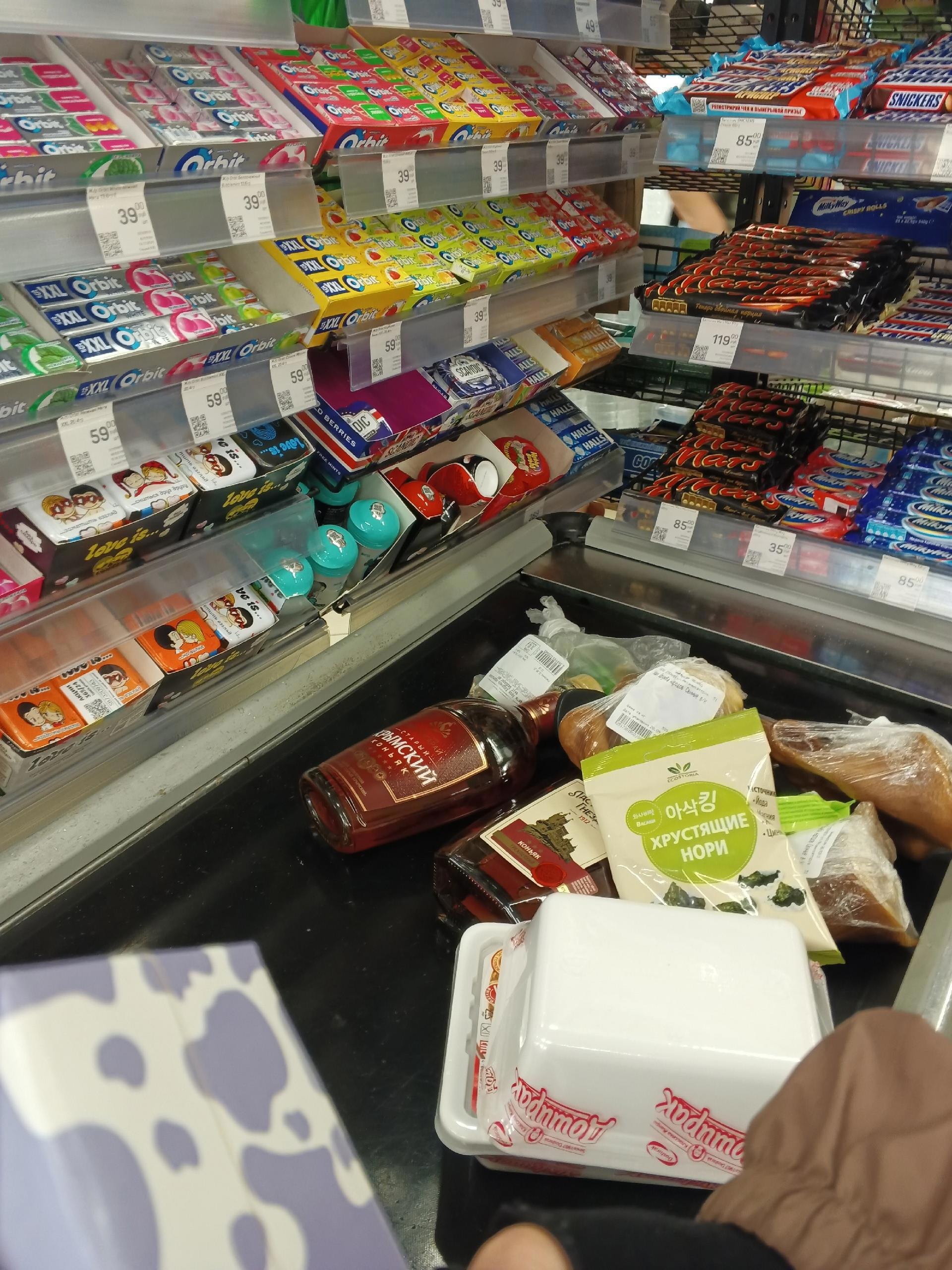 Итак: Две бутылки коньяка, свиные уши, два доширака, пачка водорослей, а пакетик с мятными леденцами поставил точку... Как мы не рухнули прямо там, не знаю. Но нас уже обслуживали, а люди стоявшие позади дамы, зажимая рты руками ретировались моментально.