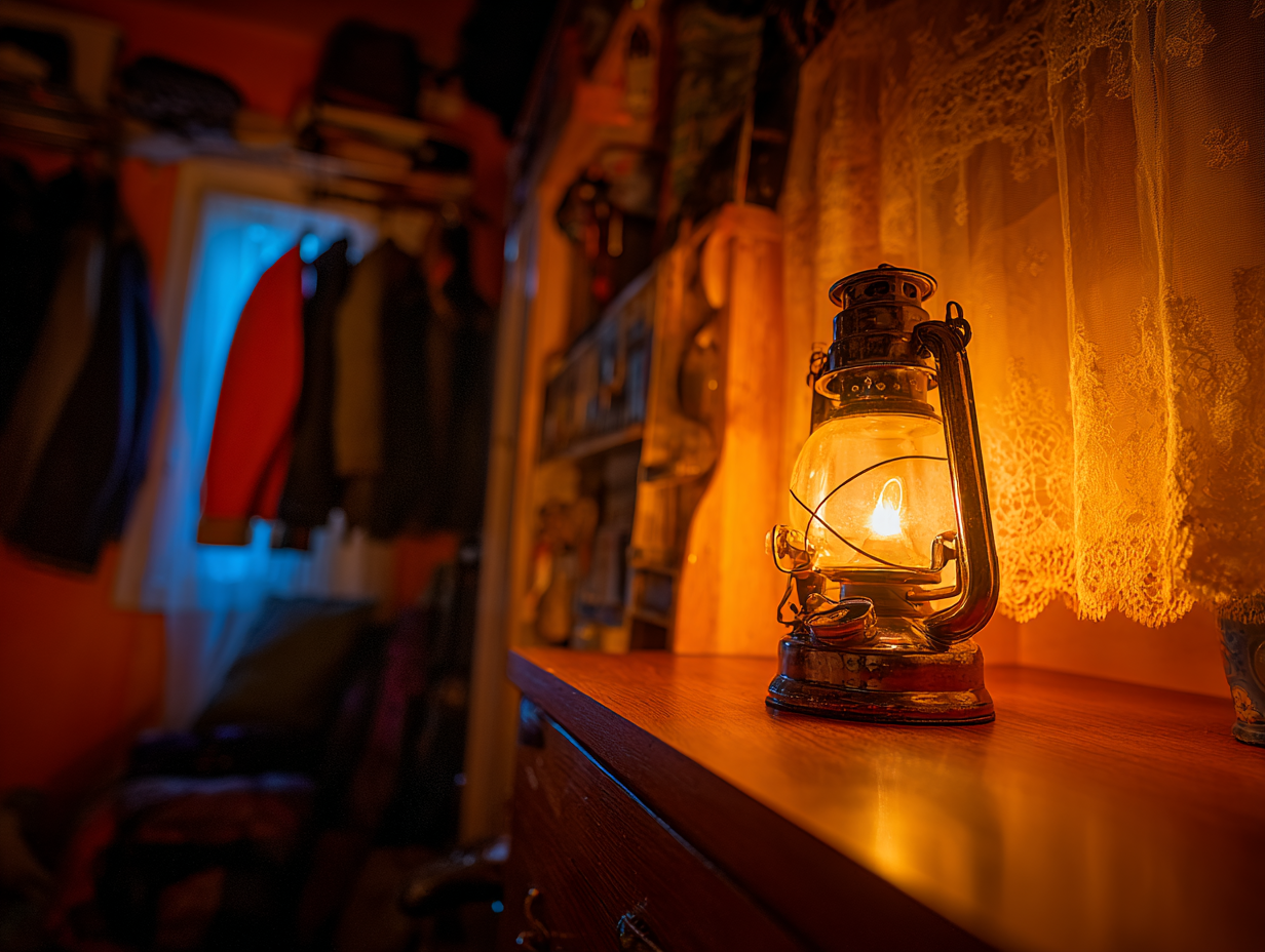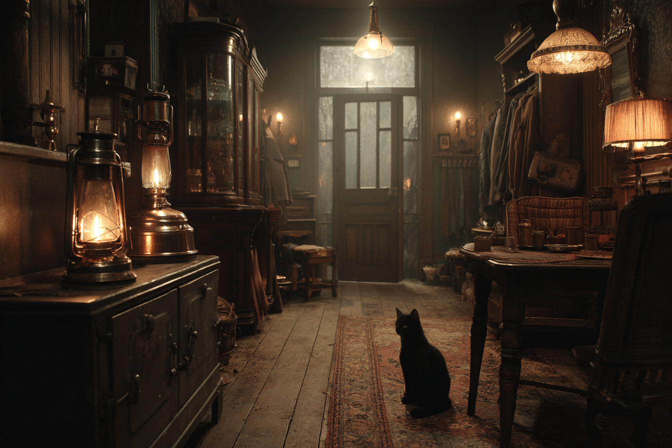 Квартира № 50. Свет здесь лукавый, ламповый. Он не просто освещает предметы — играет ими: примус, приоткрытый шкаф, тень кота, которая не обязана вести себя как кот. Гротеск растёт на тепле: чем уютнее, тем нелепее происходящее. И смешно, и тревожно — как в цирке, где клоуна ослепляет софит.
